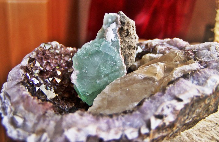 Auf beiden Bildern ist die selbe Druse zu sehen, Amethyst mit Goethit und gelbem Calcit. Unten mit einem Apophyllit