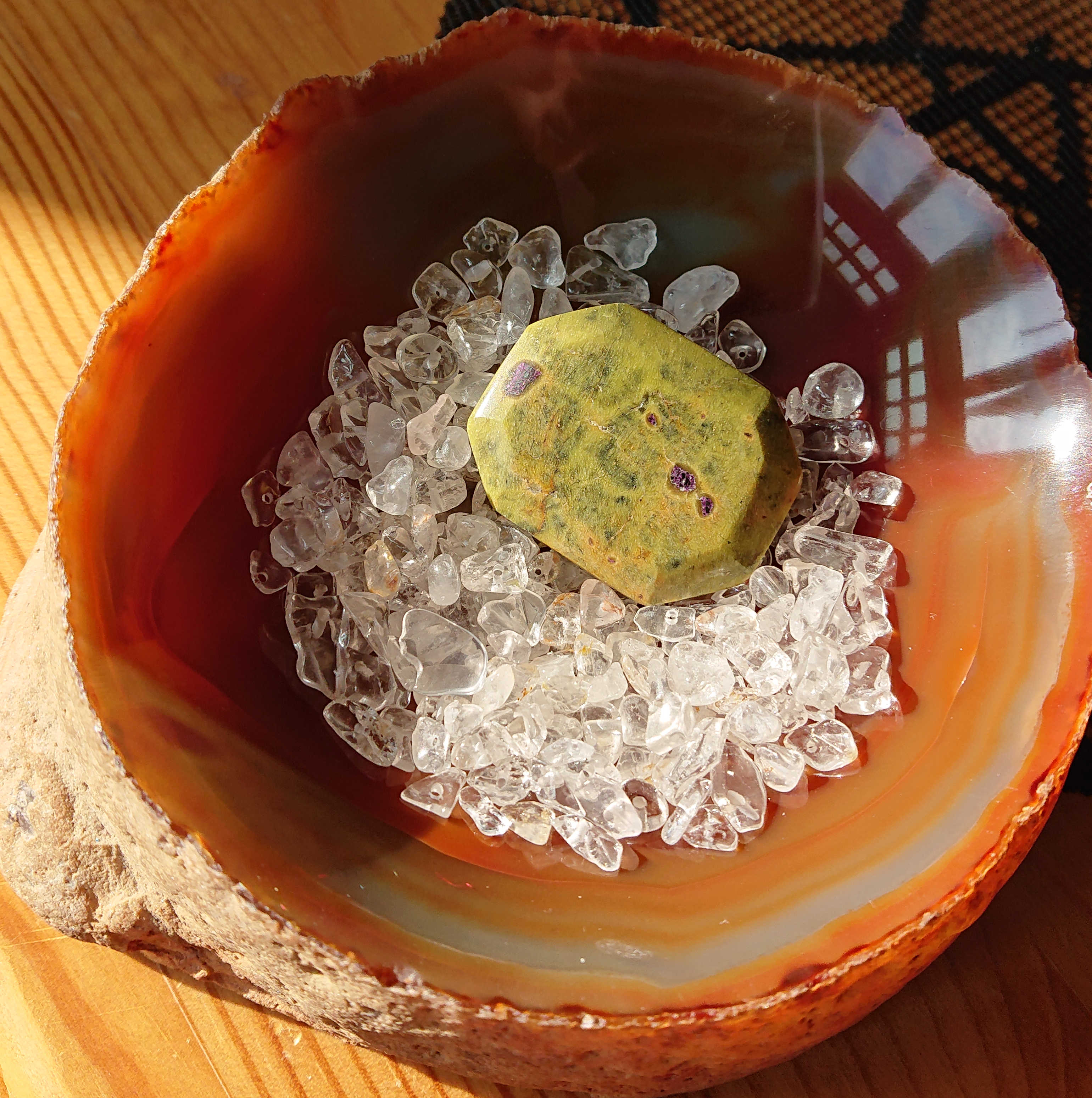 Sowohl der Stichtit pur als auch der Stichtit in Serpentin haben einen starken Bezug zu den Zähnen. Wobei der Stichtit in Serpentin sehr gut hilft bei nächtlichen Zähneknirschen und Kieferanspannung; der Stichtit bei Zahnschmerzen allgemein. Beides von mir getestet und für super befunden