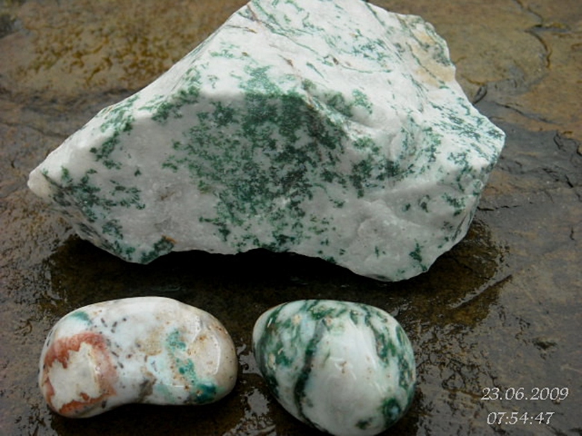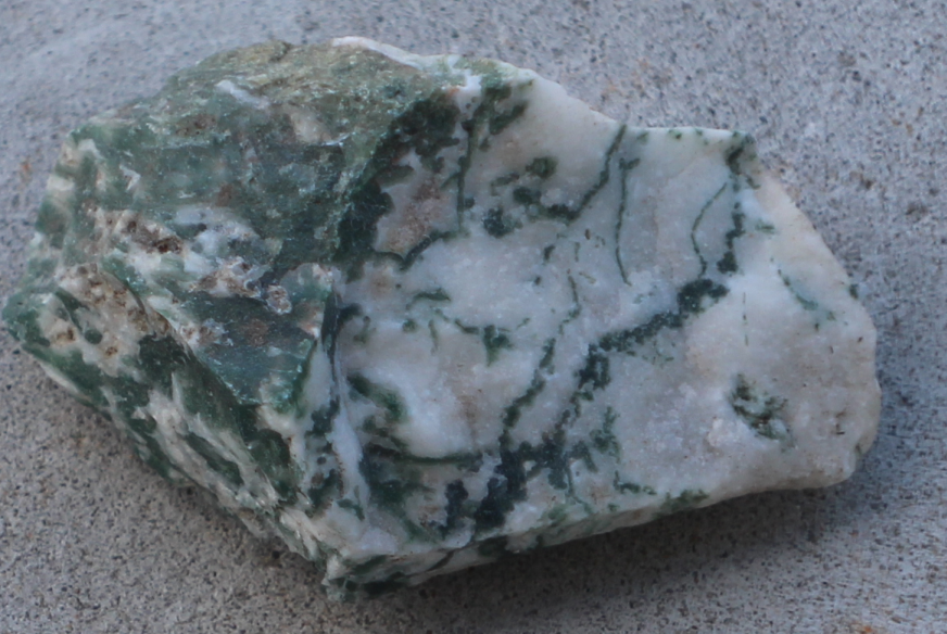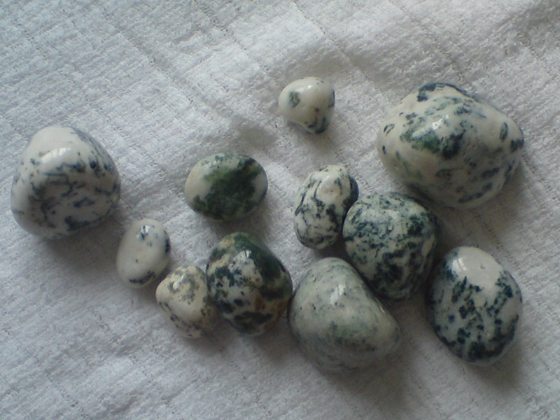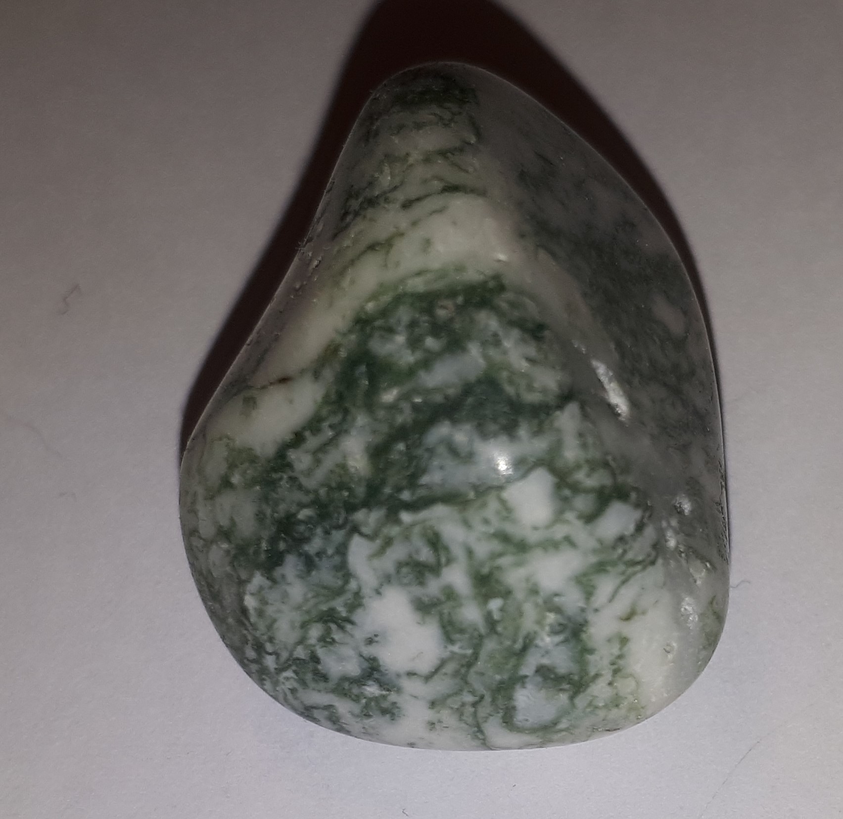 Ist eigentlich nicht wirklich ein Achat eher ein Chalcedon weiß undurchsichtig und mit hellgrünen bis dunkelgrünen Astähnlichen Einlagerungen, daher auch der Name.