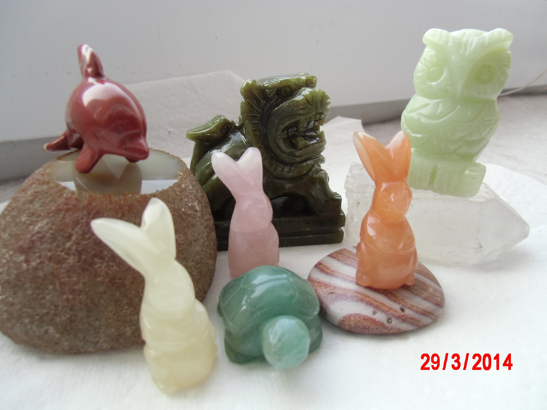 Rosenquarz, Sodalith, Bergkristall, Jade Opal mit Muttergestein Jade, Onyx-Mamor, Speckstein vermutlich auch Speckstein Aventurin und extra für Viola - meine Rattenbande auf Münzen im Detail