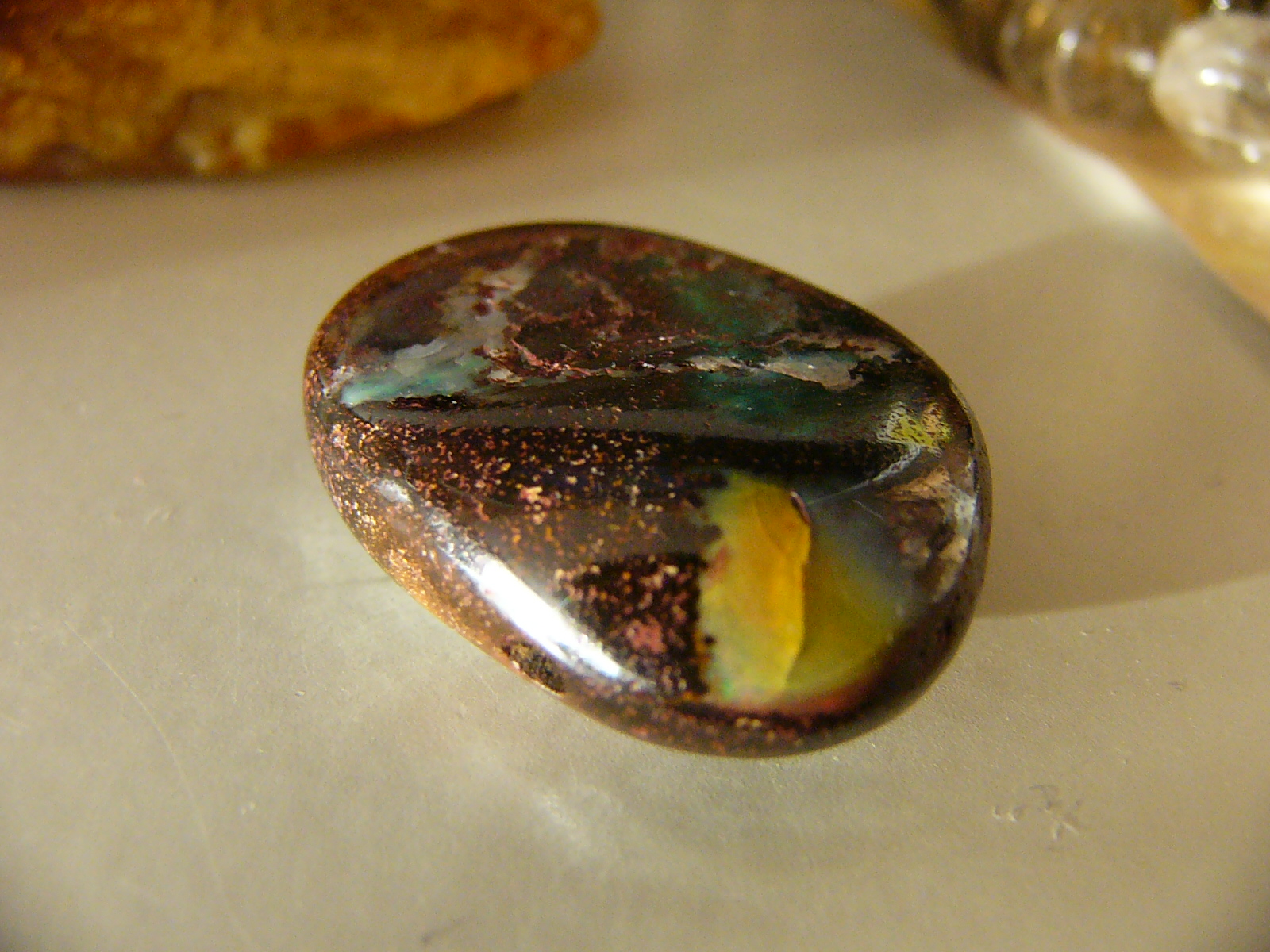 Der gelbe ist ein im Handel als Gold Lace Opalith verkaufter, Lizzy. Andere Handelsnamen für Steine die gemeinen Opal enthalten sind z.b. Honigopalith oder Moosopal.