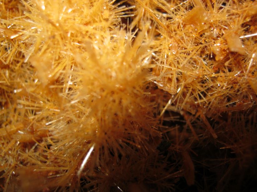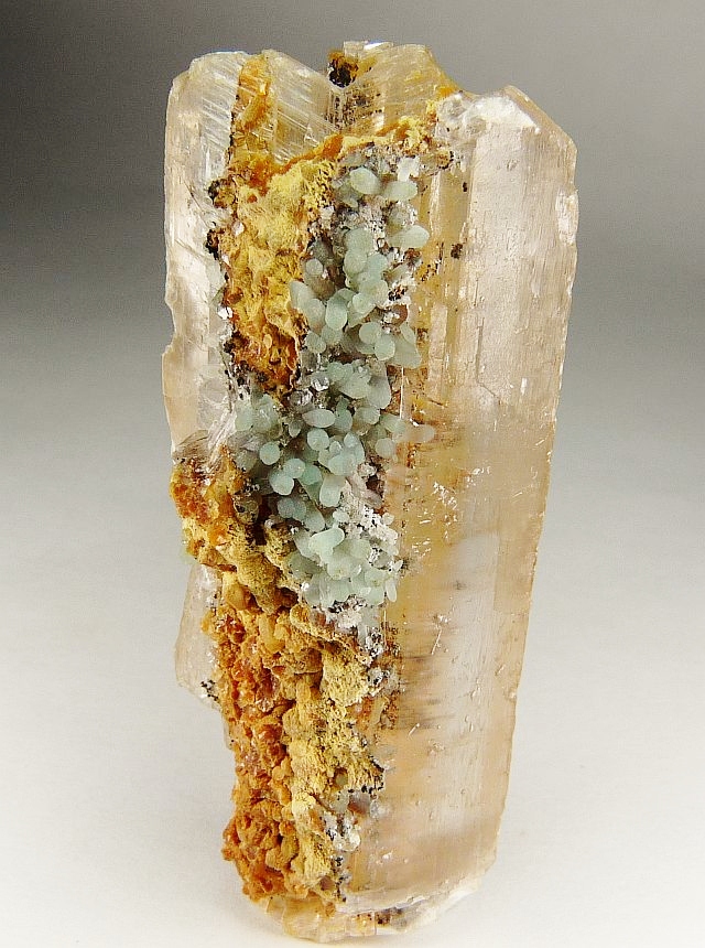 Eine Stufe aus transparenten, hochgewachsenen Gips-Kristallen. Und dazwischen sitzen gelber Wulfenit und grüne Mimetesit Kügelchen.
