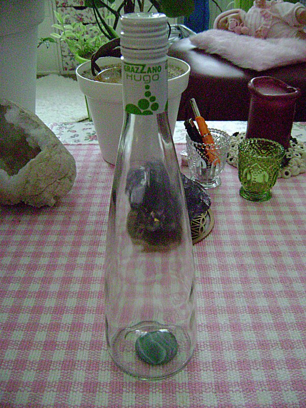 beim entsorgen einer glasflasche ist mir etwas aufgefalllen und zwar, dass der boden ein wölbung in die flasche hat. eigentlich ein mogelboden, aber für das ansetzen von steinwasser ideal geeignet. man kann einfach die flasche über die steine stellen und vermeidet damit den direkten kontakt mit dem wasser. also auch für steine geeignet, die nicht direkt ins wasser dürfen.