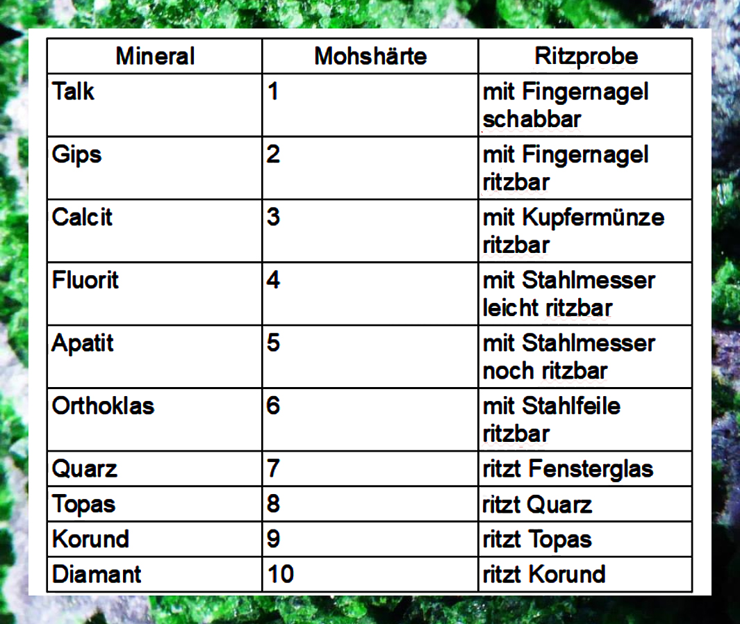 Regel: Das härtere Mineral ritzt das weichere, das härtere wird vom weichen nicht geritzt. Gleiche Härte haben sie, wenn zwei Mineralien sich nicht gegenseitig ritzen.