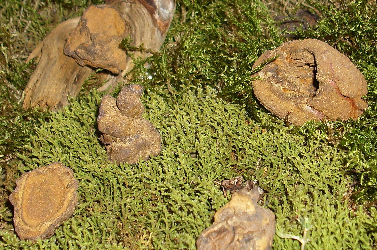 konkretionen können regelmäßig geformt sein: als blöcke, schachtelförmig, als röhren, flache scheiben, runde, eiförmige, meist parallel zur schichtung abgeflachte knollen oder kugeln (manchmal erinnern sie an kanonenkugeln). unregelmäßige formen ähneln teilen des menschlichen körpers, wie rippen oder wie ein fuß, die meist in einer art von zementationsprozess in sedimentgesteinen gebildet wurden (meist in tonen, sanden unsd erdigen massen; teilweise auch gealterten vulkanischen gesteinen). häufig entstehen sie in der umgebung von fremdeinlagerungen im sediment, z.b. von organischen resten. 'großloch-perlen' im hintergrund, gewachsen wahrscheinlich um etwas organisches herum, das sich im laufe der zeit zersetz hat 'zementation' kleiner quarzchen rechts: obendrauf so etwas kugelrundes, naja, kanonenkugel nicht grad