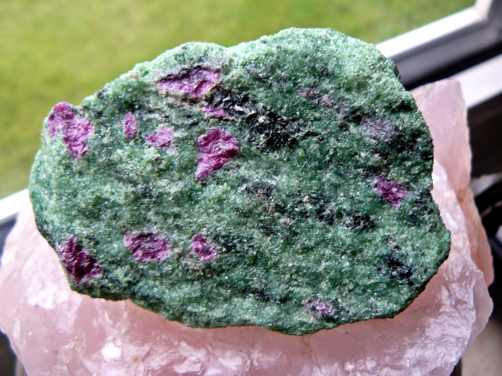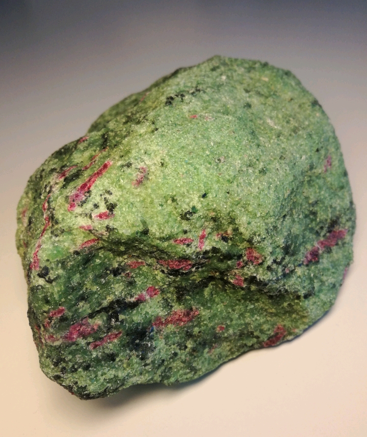 Farbe: Zoisit farblos, weiß, hellgrau, graugrün, grün, blau, mit blauschwarzen oder roten einschlüssen, Rubin rot mit violettstich