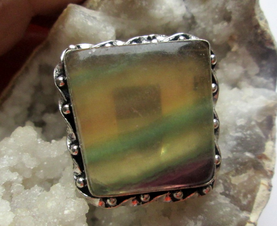 Einen Ring mit Regenbogenfluorit habe ich vorher noch nie gesehen und bin deshalb sehr glücklich und stolz darauf, dass einer den Weg zu mir gefunden hat.