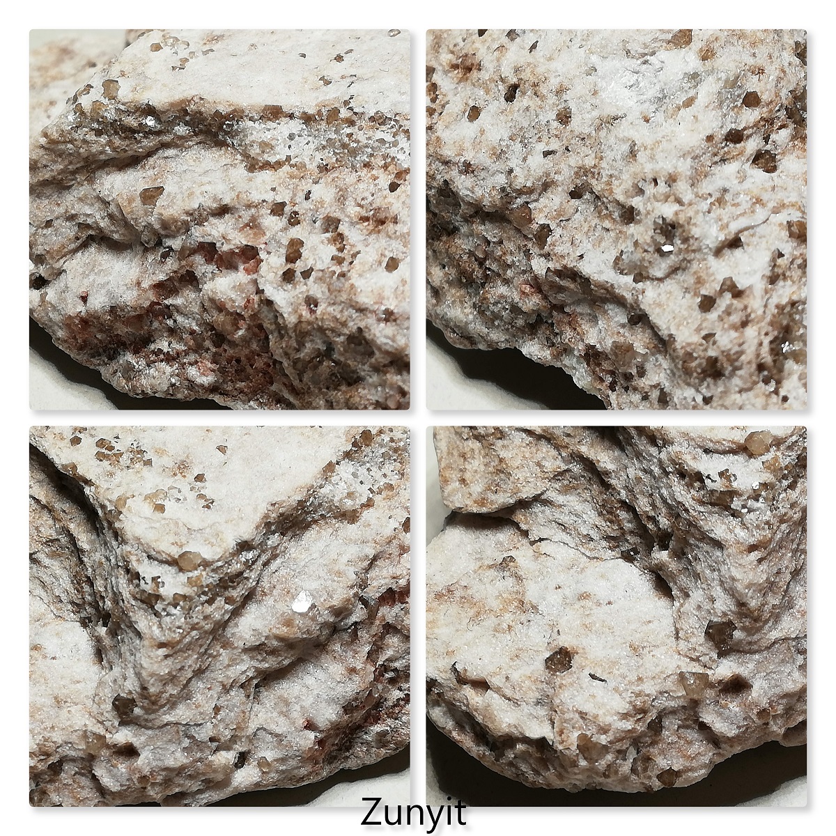 Zunyit kommt in Form von kleinen, tetraedrischen Kristallen und zwillingsoktaedrischen Kristallen vor. Das Farbenspektrum umfasst Weiss und Schattierungen von Grau bis Rosa.