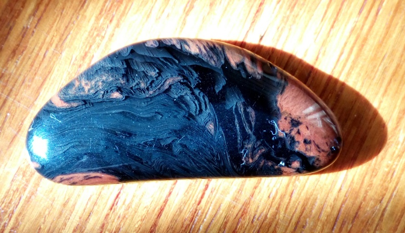 Ich denke Midnight-lace Obsidian ist noch etwas spezieller als Lamellen Obsidian, die Streifen sind stark verzerrt, weil die Obsidianschichten durch langsame Bewegung des Magmas gestreckt und gerollt wurden, teilweise wechseln sich die Lamellen mit Streifen von Mahagoni Obsidian ab.