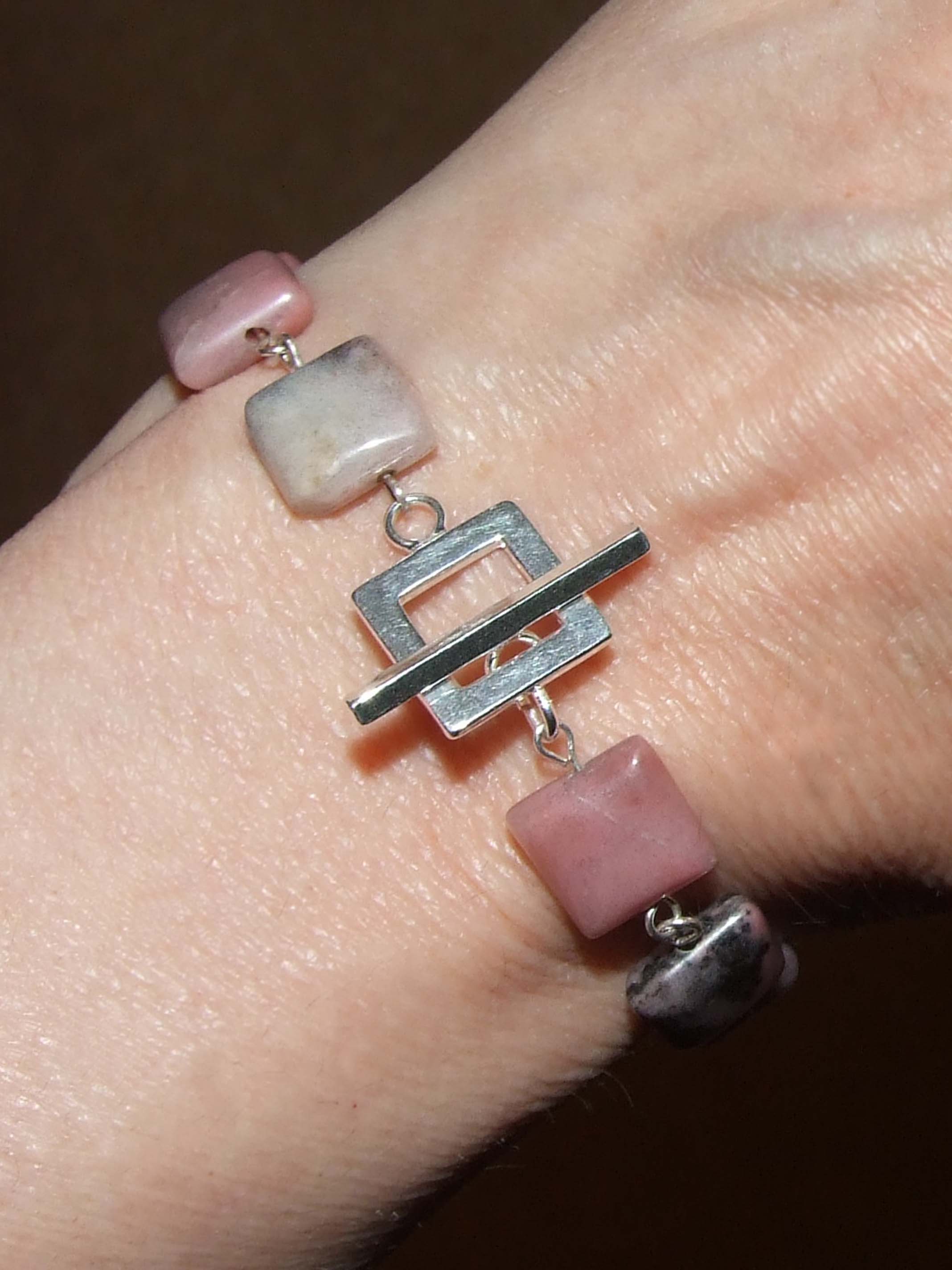 Es ist ein Armband, bestehend aus quadratischen Rhodonit-Kissen in einer Größe von 1 x 1 cm. Daher war ich der Meinung, dass der vorherige Federringverschluss irgendwie "verloren" aussah.