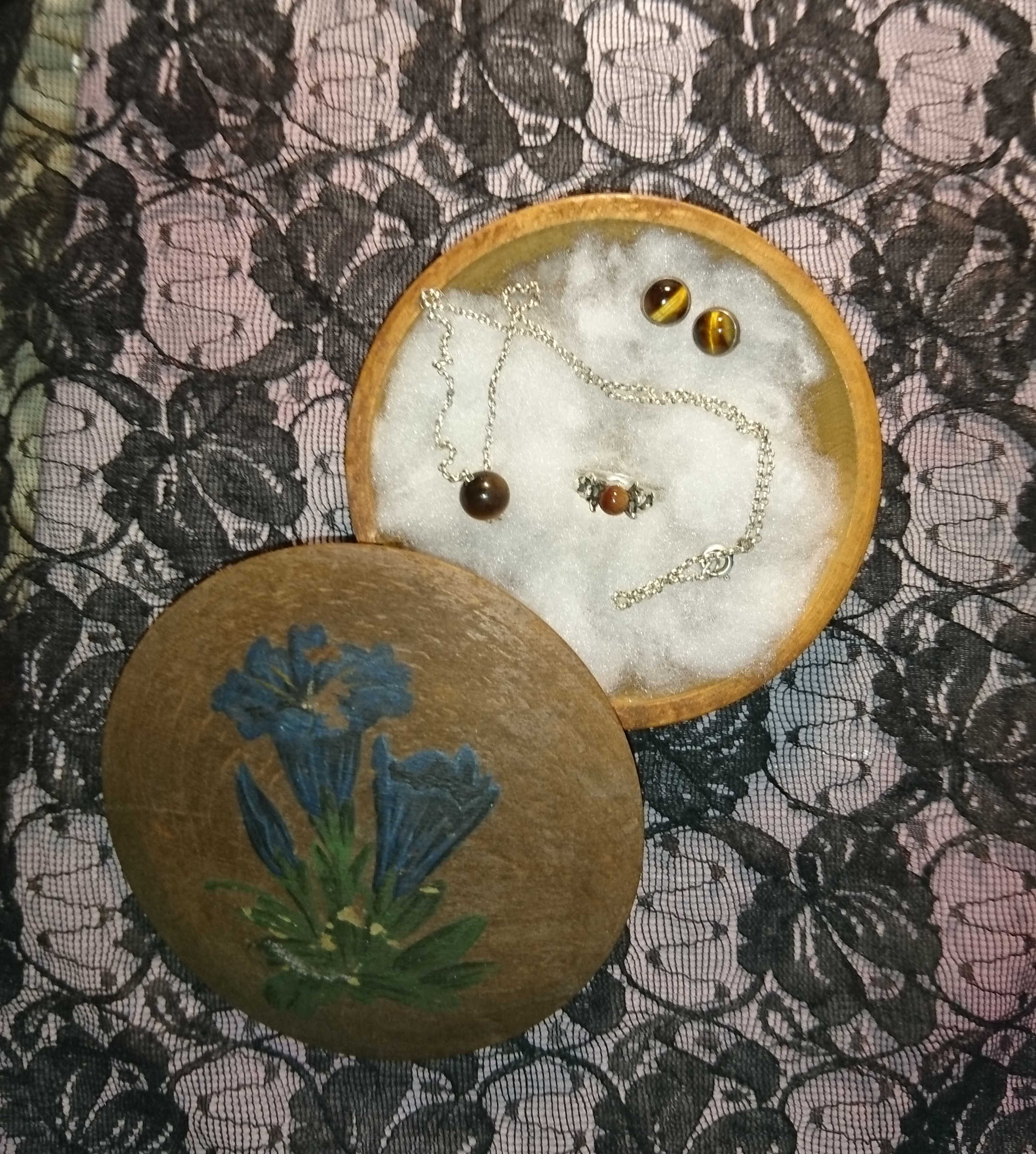 Seit ein paar Tagen einen Amulettstein und Zirkonia-Ohrringe.