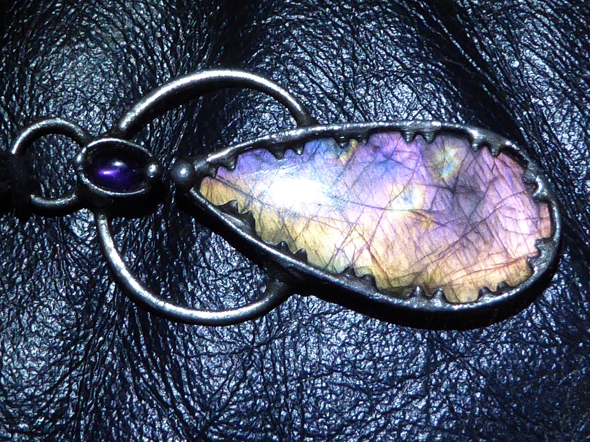 wundervoller Violett-goldener Labbi mit regenbögen in Zinn gefasst + Amethyst