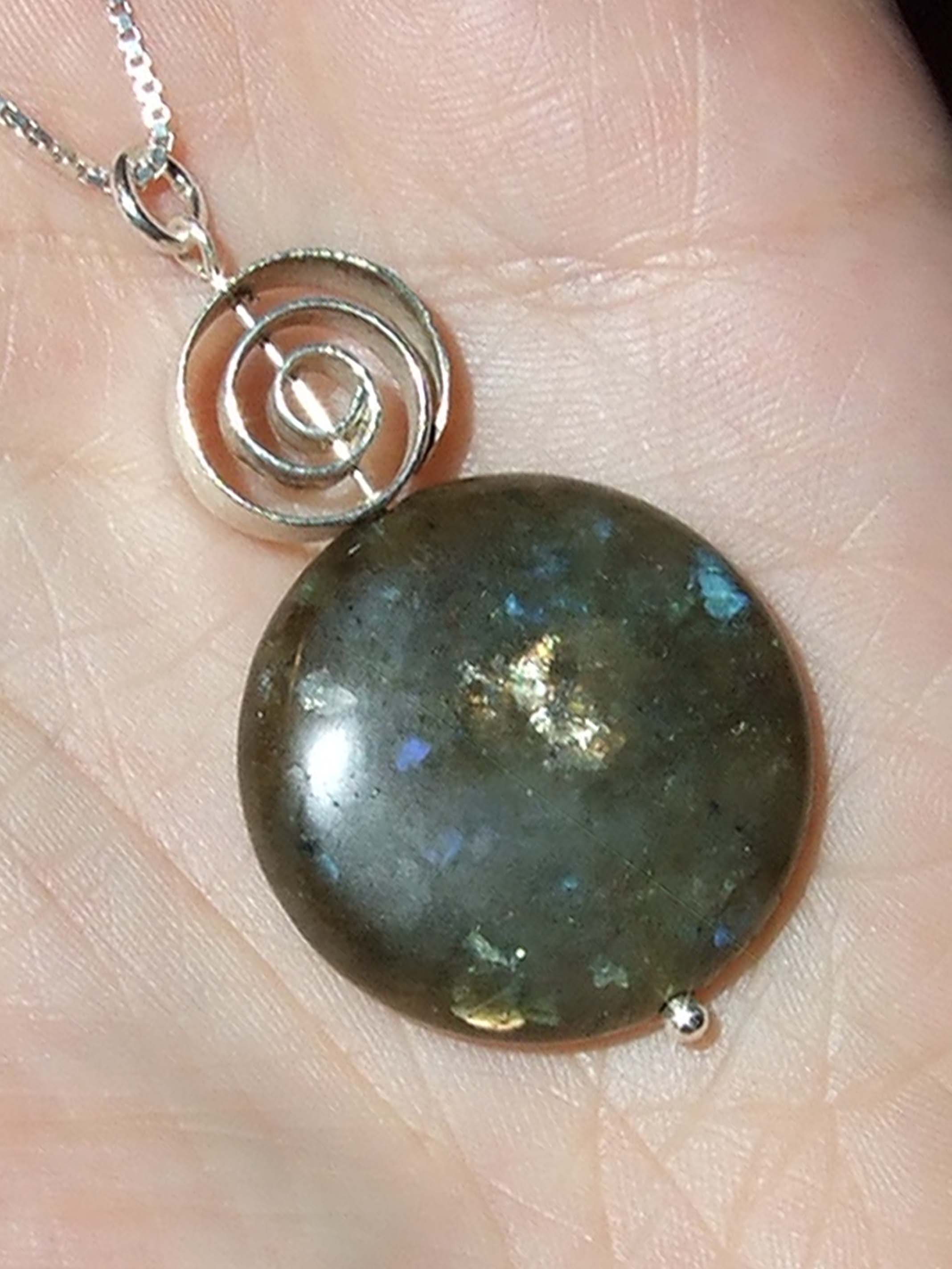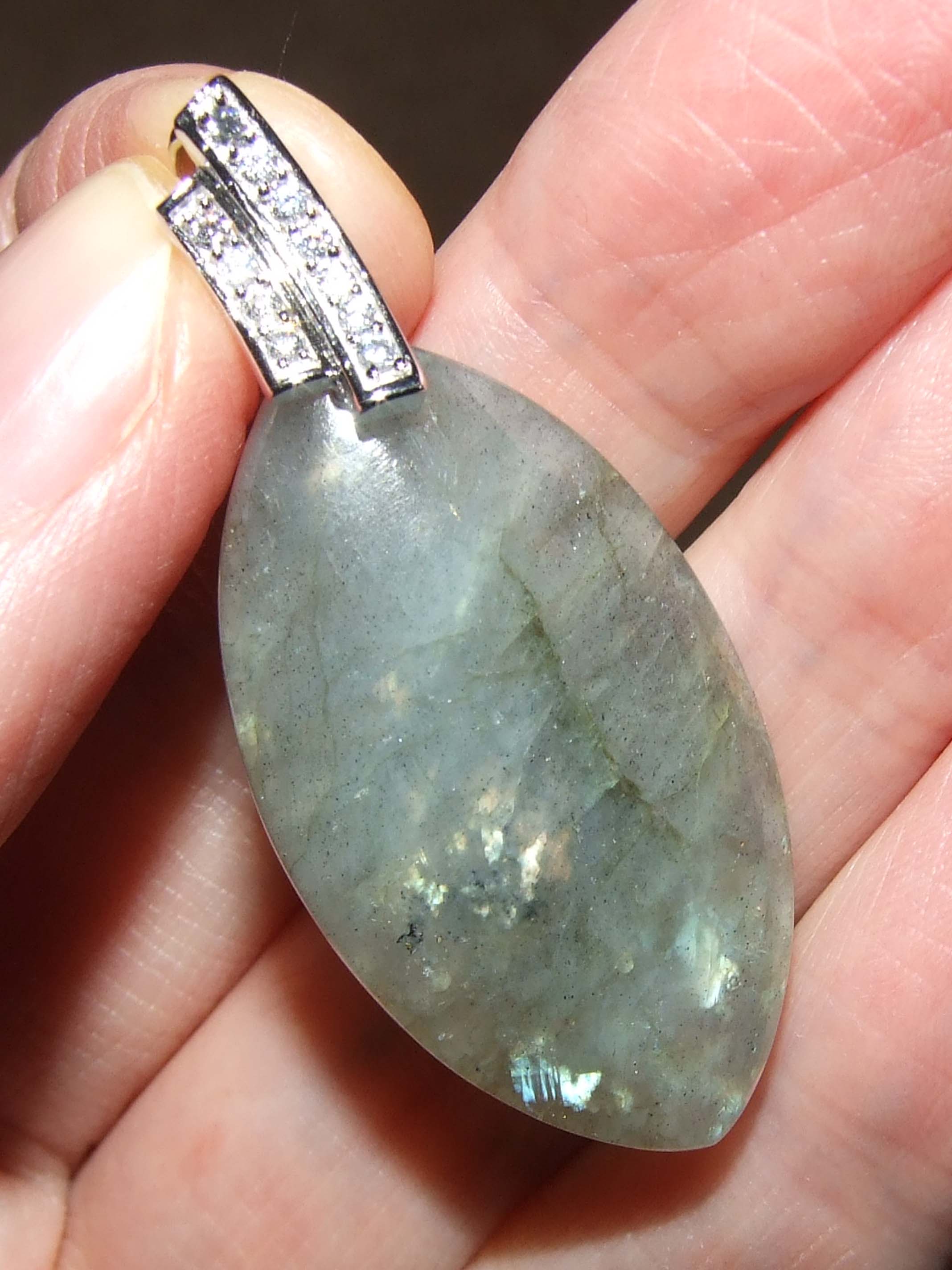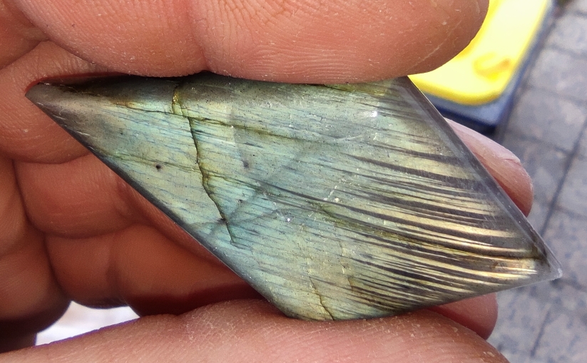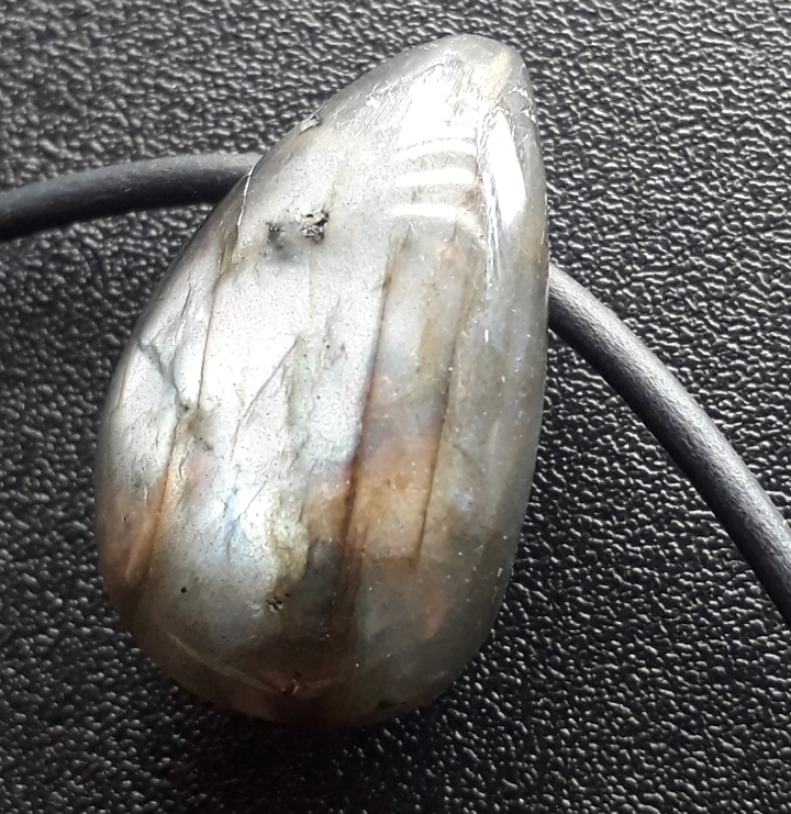 Hier zeige ich euch mal meinen etwas helleren, schimmernden Labradorit in einer Navettenform.