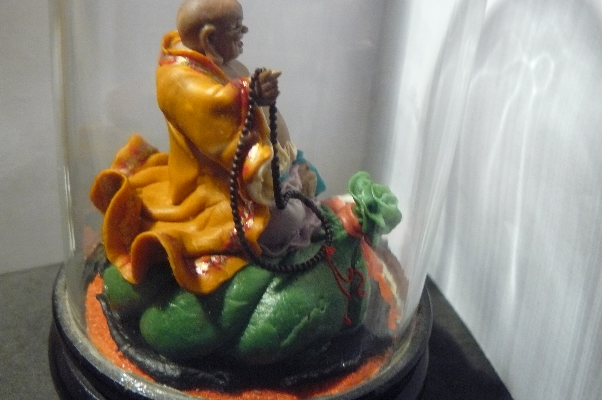 Buddha unter einer Glasglocke sieht aus wie eine Fleißarbeit aus Wachs