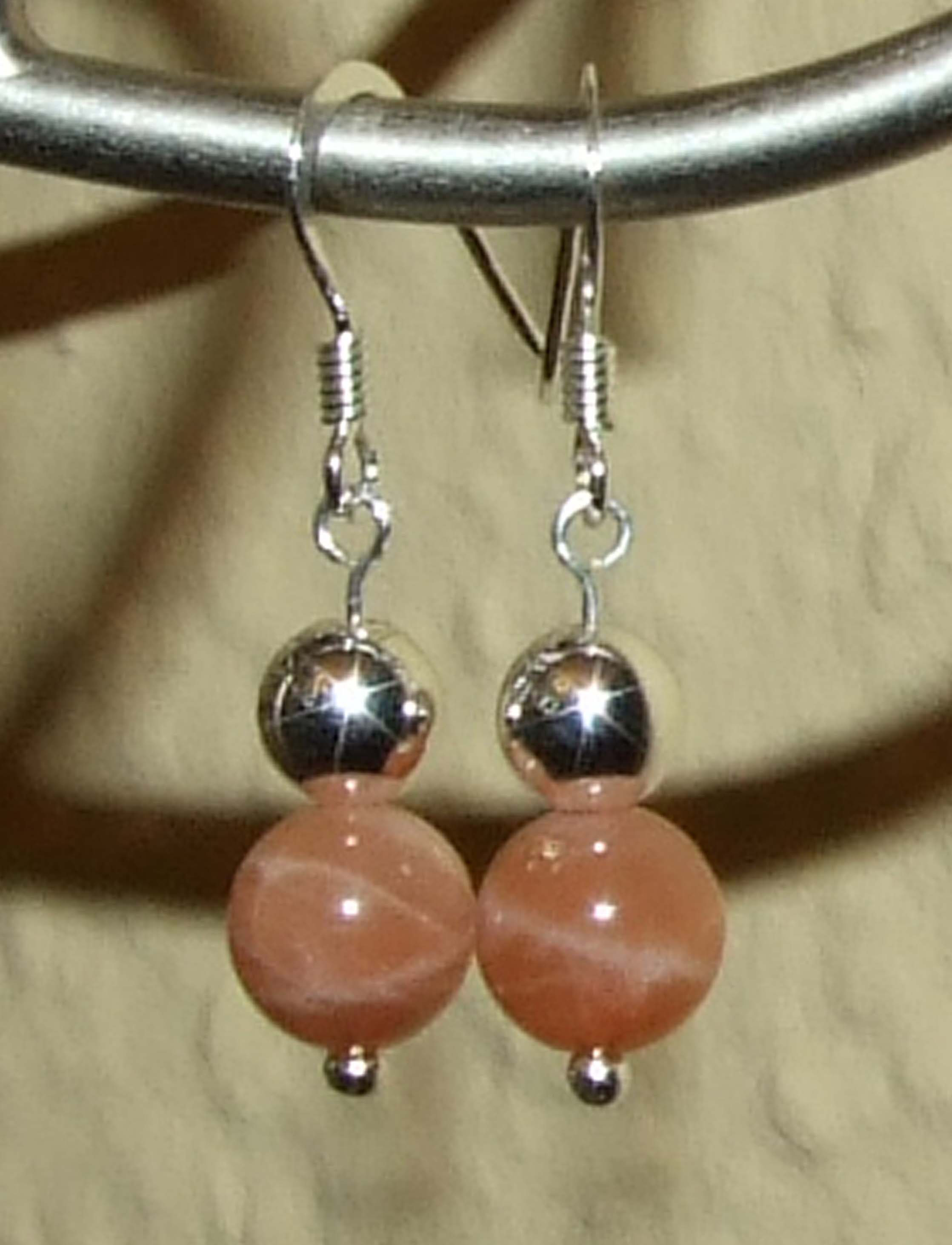Da ich diesen schönen 8 mm großen Mondstein als Strangware habe, habe ich mir natürlich gleich mehrere Ohrringe davon gemacht, aber jedes Paar immer wieder ein wenig anders, mit anderen Silberteilchen daran.
