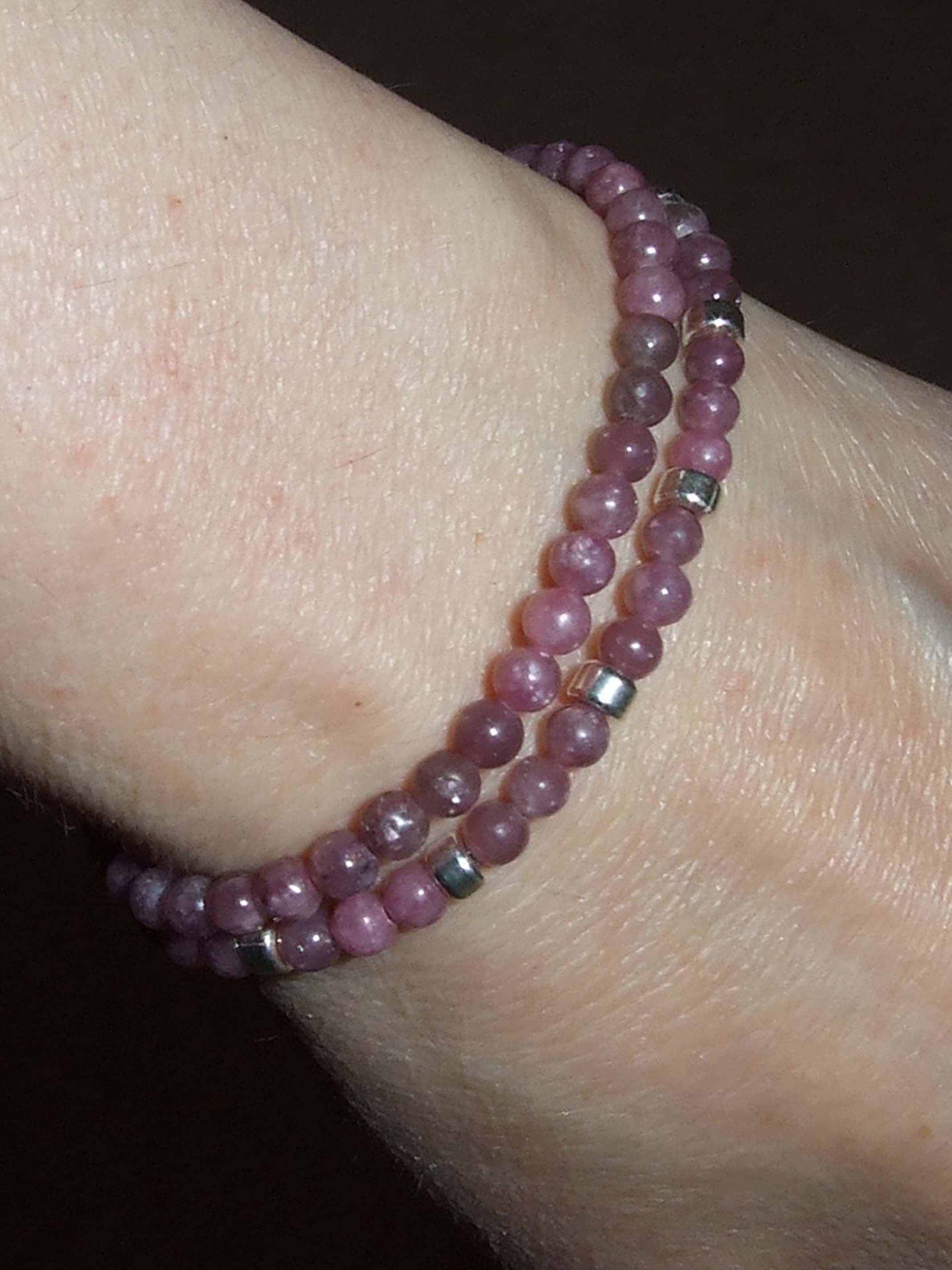 Hier zeige ich euch mein Lepidolith-Armbändel, welches aus 4 mm großen Kügelchen besteht.