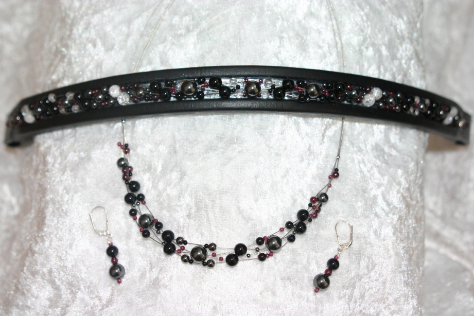 Partnerlook für mein Pferd (ein Schimmel) und mich - Stirnband fürs Pferd und Kette und Ohrringe für die Reiterin. Mit Hämatit, Onyx und Granat (im Stirnband noch Bergkristall).