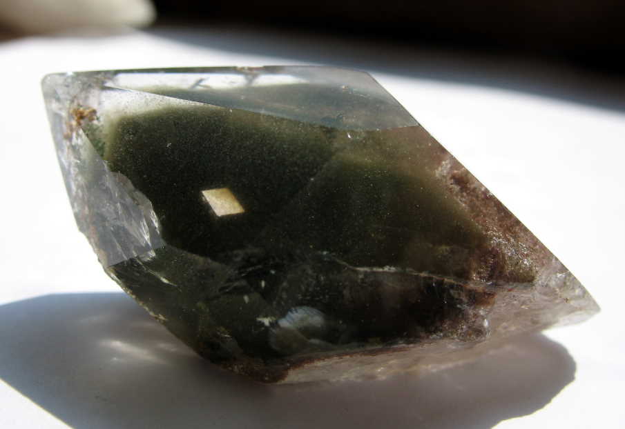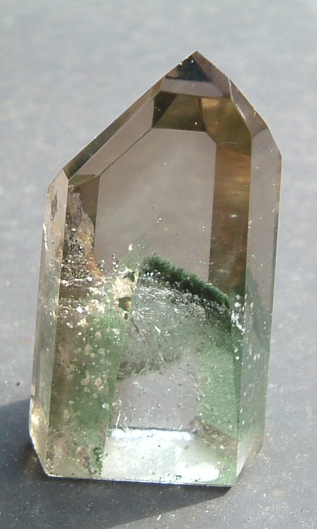 ein getrommelter Quarz mit einer etwas eigenwilligen Phantombildung u. Aktinolitnädelchen als Einchlüsse