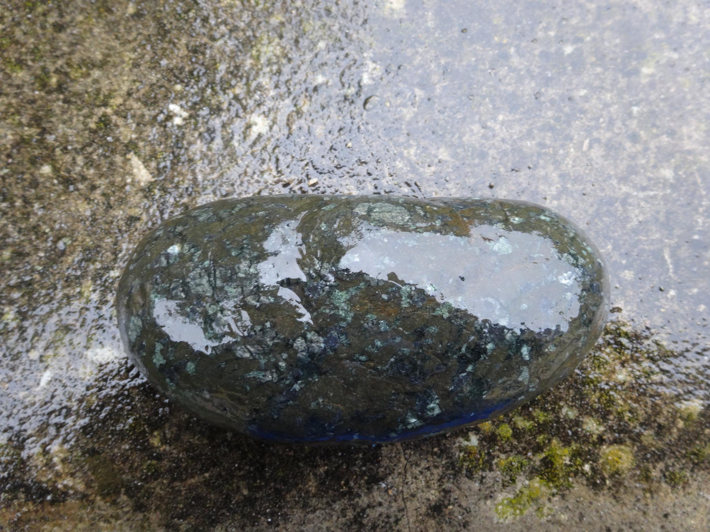 Hallo , das blaue schimmern kommt von der regenjacke ^^, der stein sieht irgendwie rostig aus und ist nicht besonders schwer für seine größe , vom gestein her ist er weich geht auch gut zum schleifen !