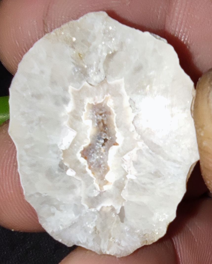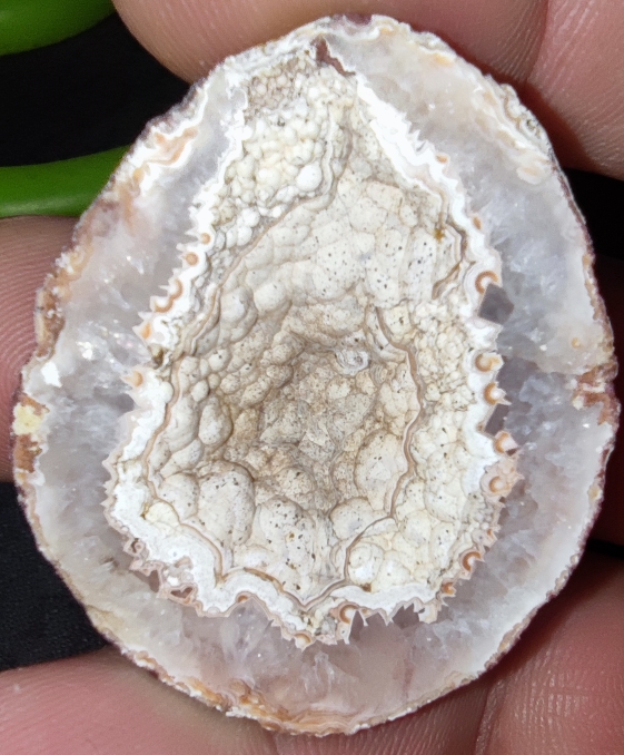 Den Anfang macht gleich das schönste Exemplar, welches mir am Ende auch noch leicht weggebrochen ist. Aufgrund der äußeren Struktur vermute ich, dass dieser ursprünglich einmal die Füllung von einer Kugel war, die wohl zerbrach und den inneren Bereich somit freigab. Zum Glück ist der weggebrochene Bereich nur klein so dass ich diesen durchs schleifen ebnen kann.