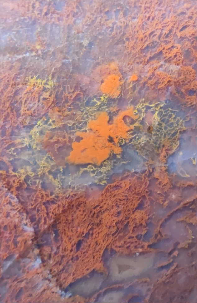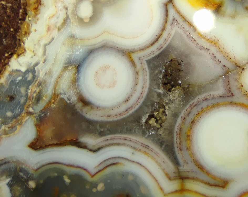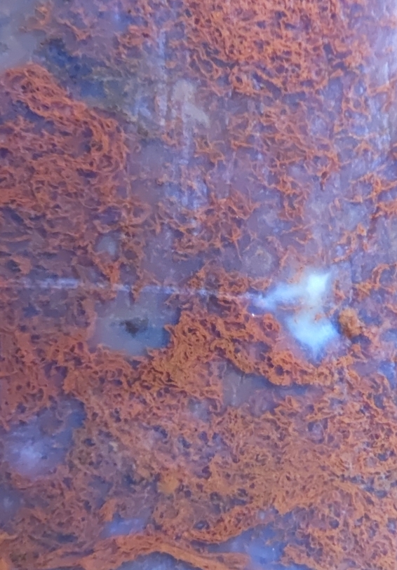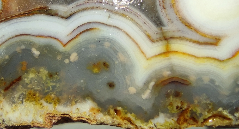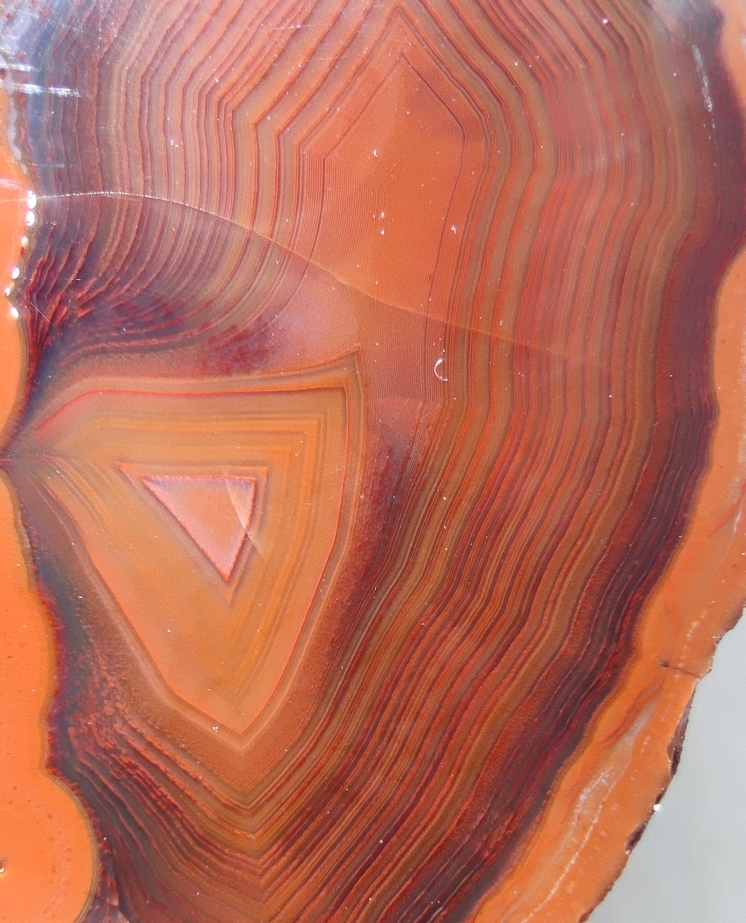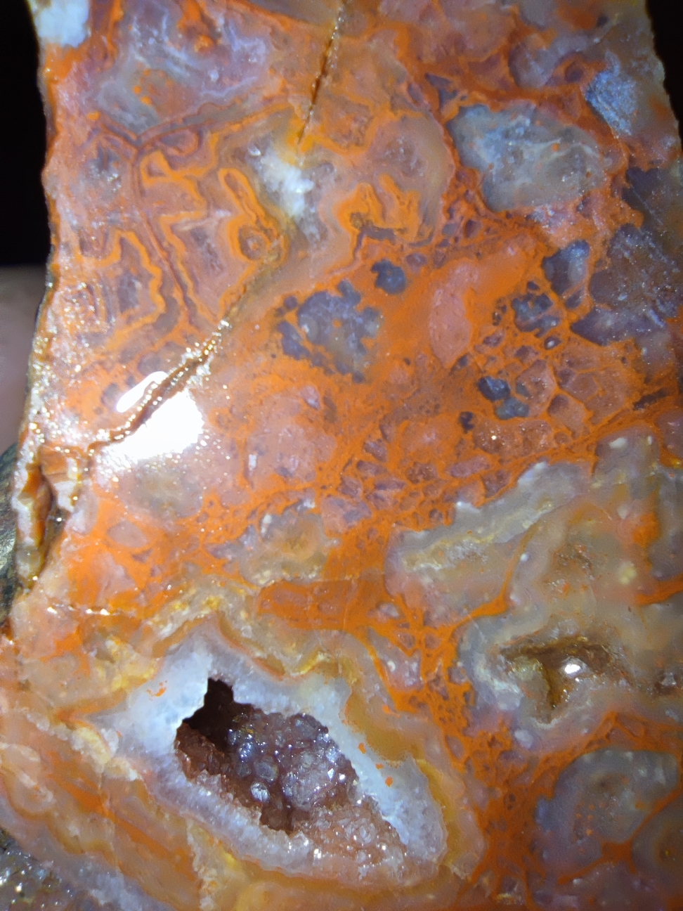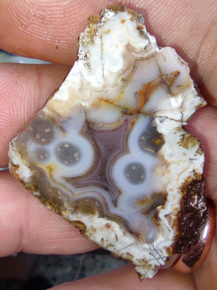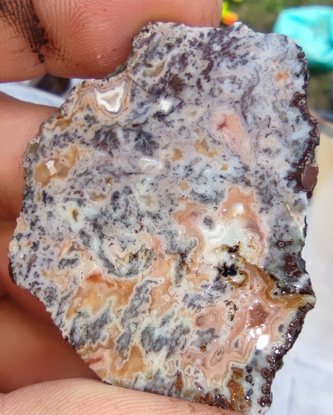 Manche Achate verraten einem schon von außen, was in ihnen versteckt seien wird. So hat zum Beispiel dieses Stück außen kleine absplitterungen, die einem verraten, dass in ihm mindestens die gleiche Farbe steckt, wie bei dem Bild darunter.