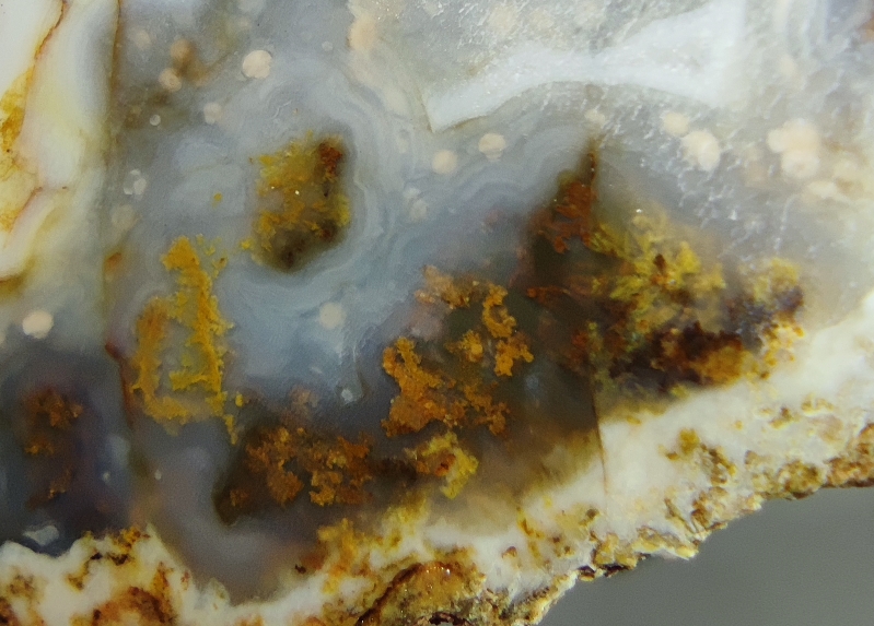 Unten rechts = kleine Fragmente aus Achat-Adern mit verschiedenem Reinheitsgehalt. Teilweise Achat oder Porzelanachat.