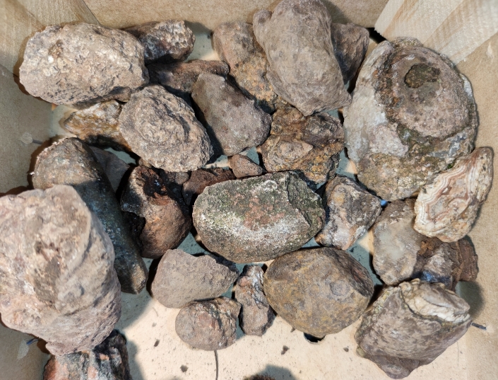 Ich habe eine richtig gute Ausbeute, wobei die meisten nur mit Erde oder ähnlichem gefüllt sind. Ich werde sie so nach und nach alle aufsägen und hoffe, wenigstens ein paar schöne Stücke dabei zu haben.