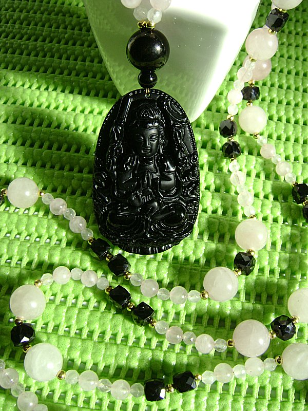 hier eine meiner Kuan Yin ketten. rosenquarz z.t. facettiert und schwarze facettierte spinellwürfel, der anhänger soll obsidian sein. wie so oft, kommt das tolle glitzern und schillern der facettierten steine, auf den fotos gar nicht rüber.