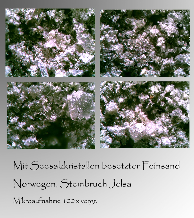 zum Thema "Öffentliche Anlagen" habe ich kürzlich eine Enttäuschung erlebt. Mein Besuch am Meer und einer Stelle an der Bagger und Baumaschinen Sand und Kies aus Schiffen und Schuten verladen endete mit der Feststellung: Der Sand ist für Sammler nicht interessant. Er kommt aus Jelsa /Norwegen und nicht aus der Ostsee wie vermutet. In Norwegen wird er in einem Steinbruch hergestellt. In Deutschland dann z.B. in "Öffentlichen Bereichen" verarbeitet. Nur die Sache hat einen Nachteil. Der Sand wird vermutlich mit Meerwasser als Verladehilfe gespült. Besser weiß ich es nicht. Das Ergebnis seht Ihr auf angehängtem Bild. Eine Mischung von Sand, Salz und Mee(h)r.