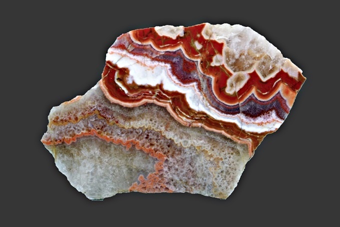 entwickelten sich dann Lagen von von Calcedon (gerade ,rund u.u.u.) unterschiedliche Mineralien in gelöster Form waren für die Bildung der Farben