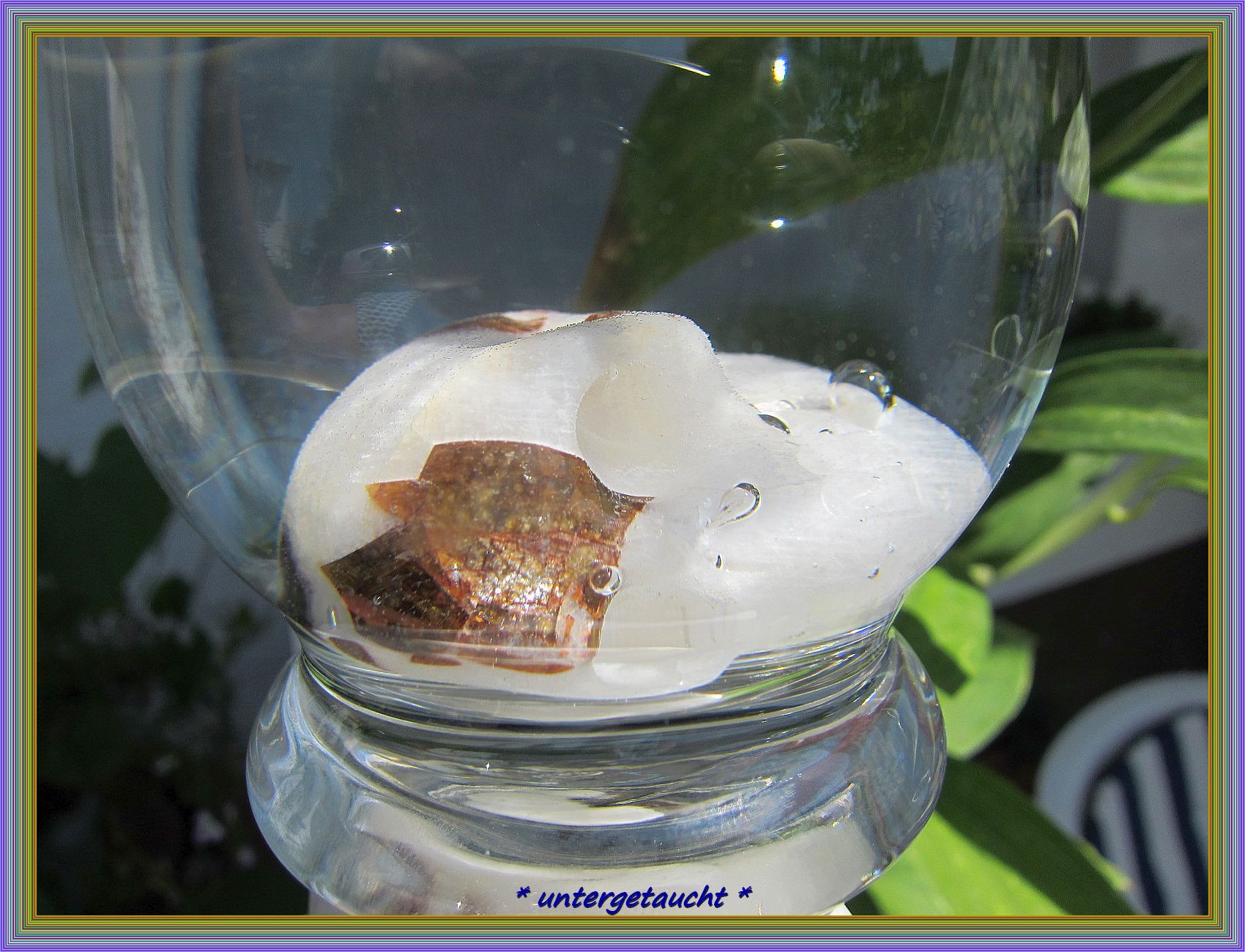 Da ich etwas las, dass Kryolith sein lichtbrechender Index im Wasser so stark wäre, dass man ihn dann faßt nicht mehr darin ausfindig machen kann, mußte ich das ausprobieren. Nun, ohne Erfolg, jedoch zeigte er mir dabei sein Schimmern auf dem braunen Köpfchen.