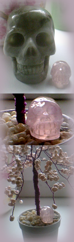 heute ist mein kleiner rosenquarz skully endlich eingetroffen. ein winzling und maah'al hat sich gleich seiner angenommen, aber das hat ihn glaube ich verschreckt. er wollte dann doch erstmal lieber das plätzchen unter dem perlenbäumchen, um sich dort von der langen reise zu erholen.