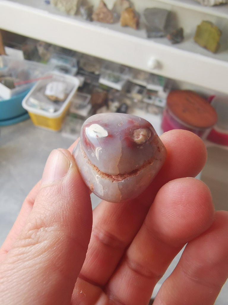 Bin gerade wieder dabei ein paar Moosachat zu trommeln. Bevor dieser im 2.Gang zerbricht habe ich nochmal schnell ein Bild gemacht. Ich seh ein Gesicht, sogar mit Haaren (Seitenprofil)