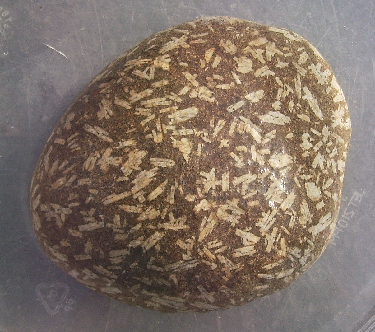 diesen ca 20 cm Brocken haben wir in Oberbayern, nähe des Inn in einem geschotterten Feldweg gefunden... es blitzte nur ein kleines Stück us dem Boden heraus... bin dann später wieder hin und hab den ausgegraben.... tippe auf Porphyr... die weissen einschlüsse stehen etwas hervor ( drum tippe ich auch nicht auf schalenreste von urzeitlebewesen ) und sollten demnach Feldspat sein......
