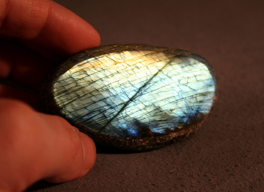 Seit heute mein... ein schönes, vorne halbrund angeschliffenes Stück, etwa so groß wie meine Handfläche (ohne Finger natürlich). Leider gibt er seinen Schimmer nicht so ganz preis, aber auch so finde ich ihn wunderschön...