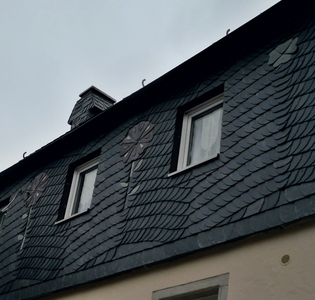 obwohl ich nicht aus einer ausgesprochenen schieferabbaugegend komme, wurden hier im frankenwald früher hausdächer und hausfasaden mit schiefer gedeckt/ verkleidet. da guter schiefer, als baumaterial doch inzwischen kostspieliger ist als andere materialien, wurden neuere bauten seltener mit diesem durchaus sehr schönen und lebhaft wirkenden stein gedeckt. seit einigen jahren jedoch entdeckt man immer wieder schmucke hausfasaden, in denen sich schieferdecker (wie man dachdecker hierzulande nennt) in ihrer kunst der schieferverarbeitung ausleben durften.
