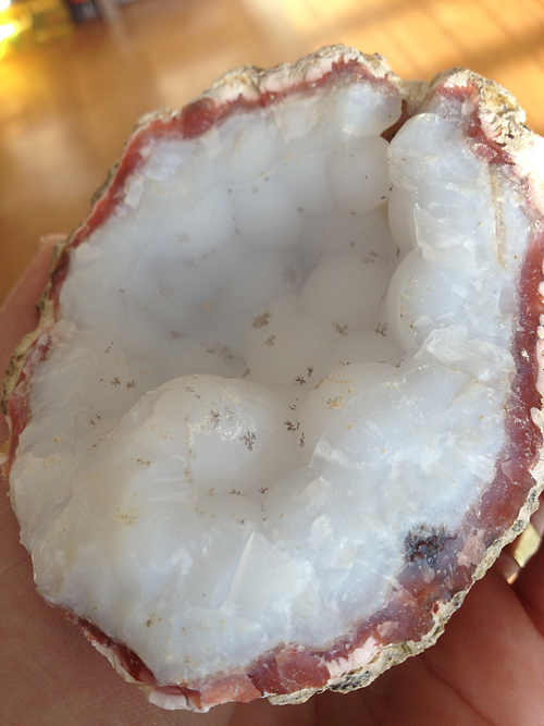 Alsobei deinem Stück ahndeltes sich um eine Achatgeode mit rotem Achat mit Chalcedon Füllung und Psilomelan Dendriten.