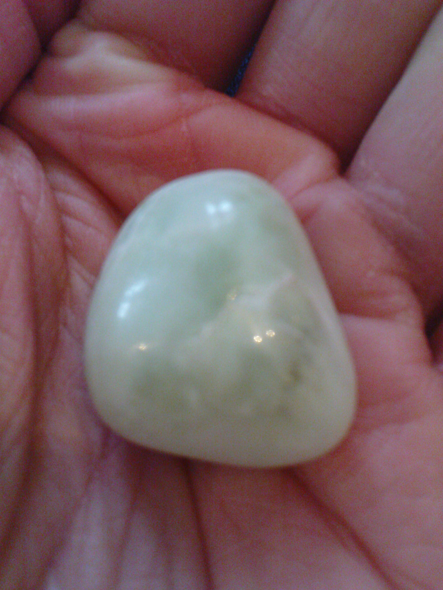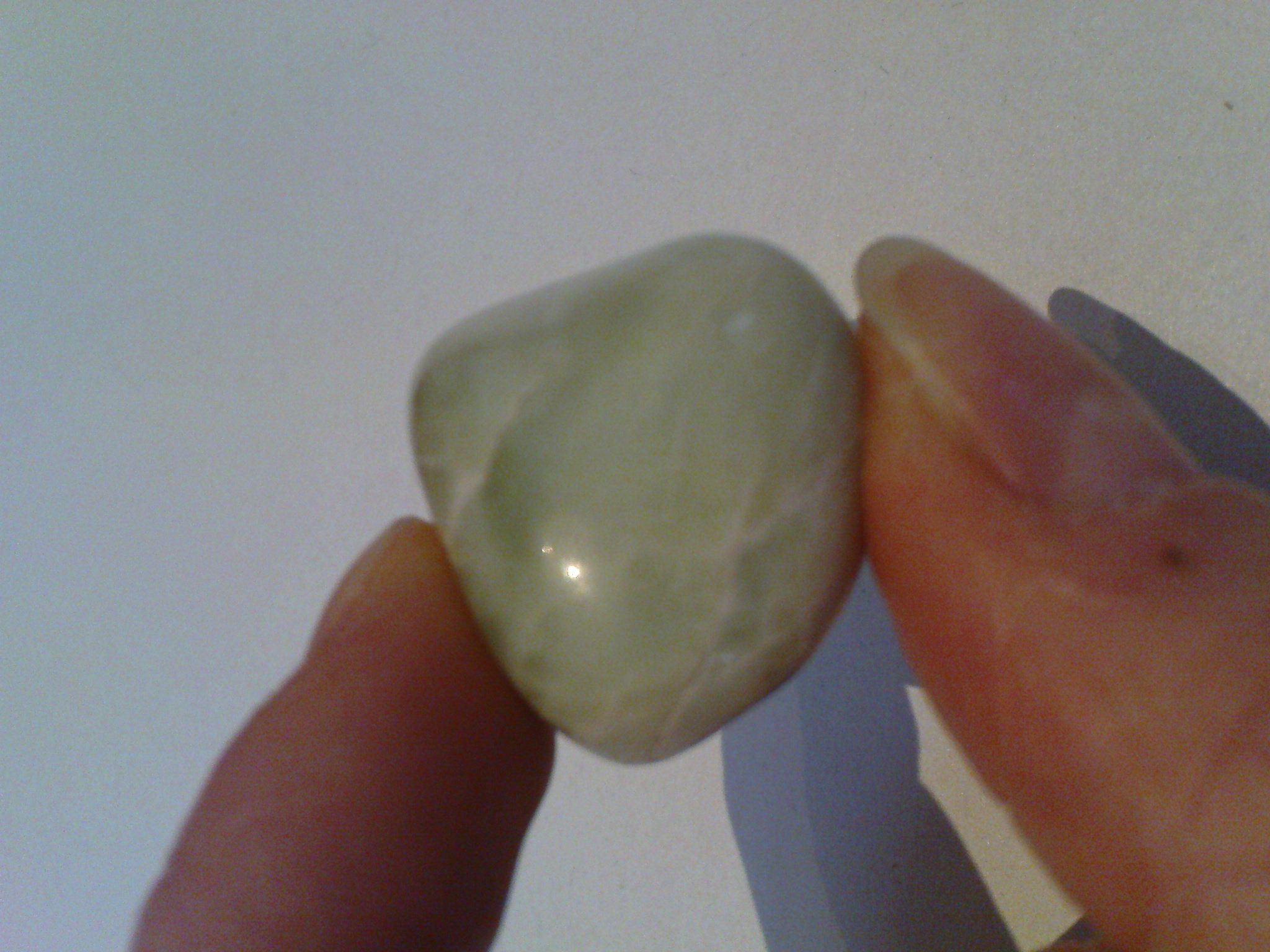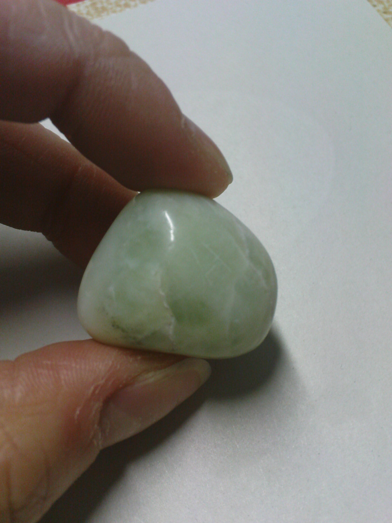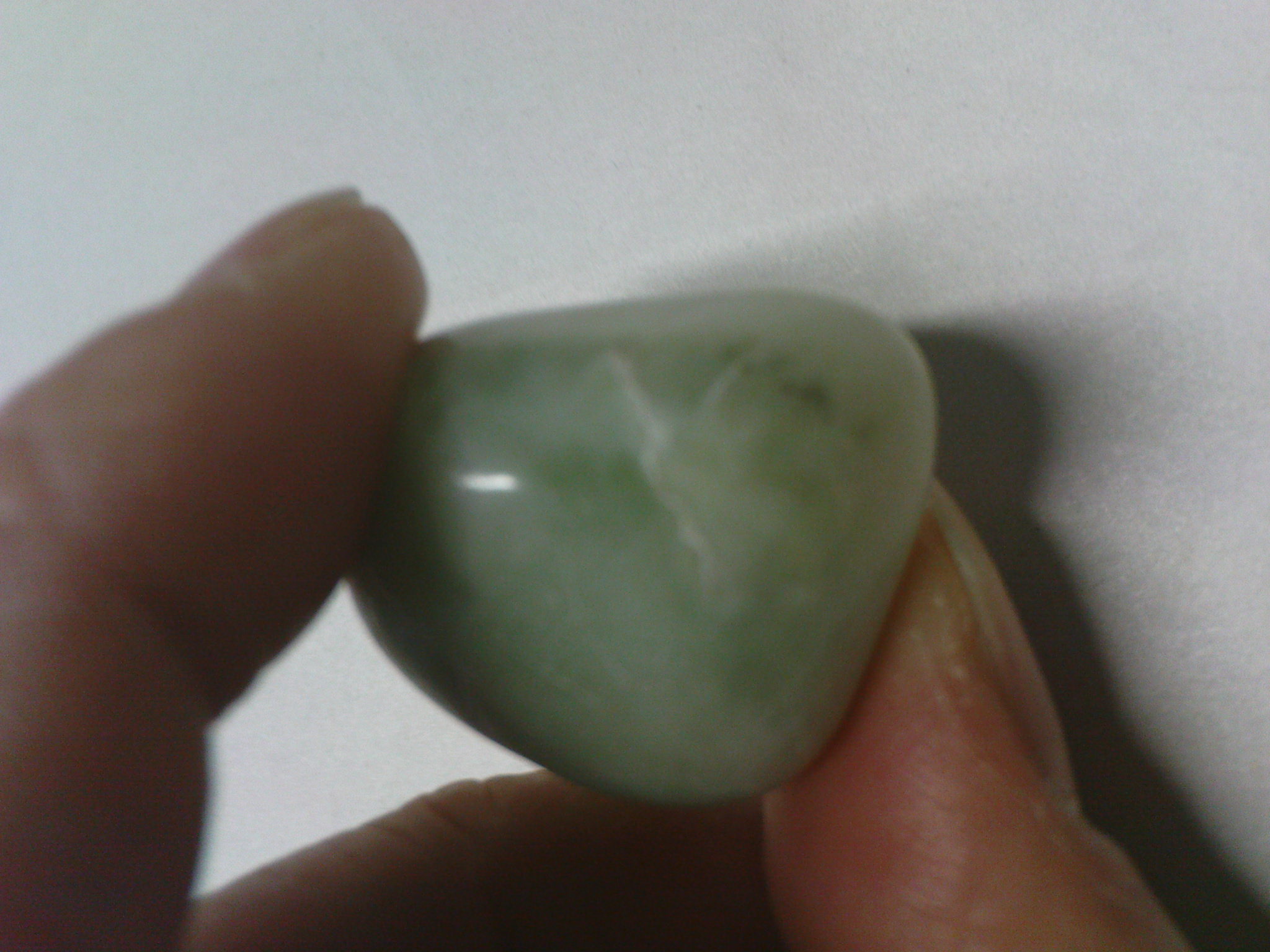 Und hier nochmal einer, der nach seinem Namen fragt. Er ist hauptsächlich milchig-weiß und an manchen Stellen hellgrün. Der Stein ist sehr matt. Hoff das geht mit den Bildern ein wenig...