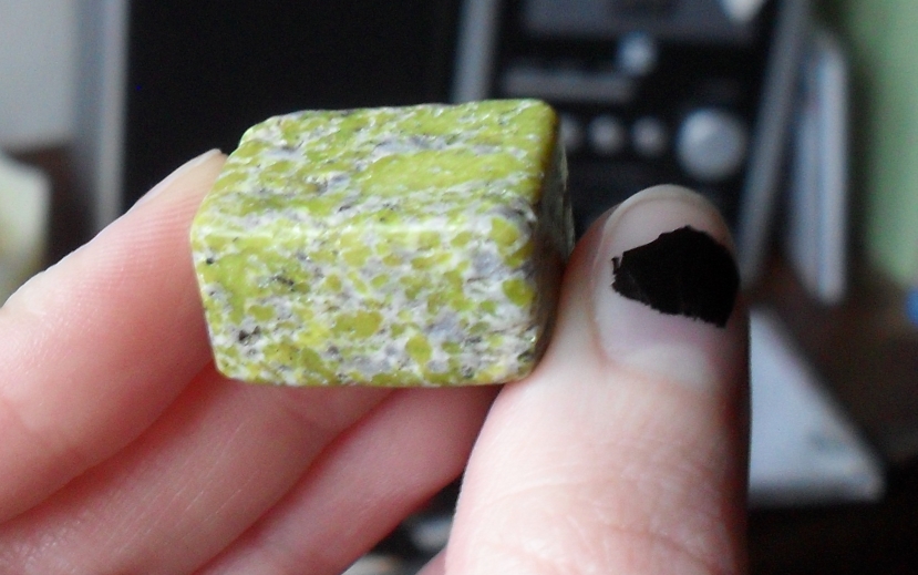 Der Gelbe Wunderling fühlt sich speckig an, die "Koreanische Jade"/Serpentinit auch, aber stumpfer. Der Labradorit bzw. ebentuell Larvikit erinnert mich an Labrador. Jenen Naturstein, aus dem man z.B. Küchenplatten macht. Abgesehen mal von den Einschlüssen, die, ganz ehrlich, wie Schorf aussehen.