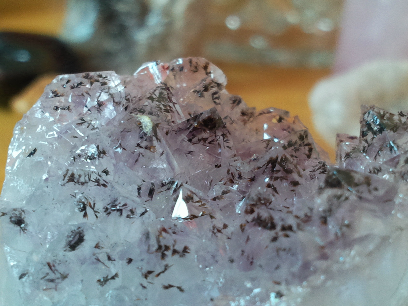 die beiden zusammen der Amethyst weist wunderschöne (winzigen, schwarzen Federn ähnelnde) Einschlüsse auf die Ozeanerkugel.. Liebe auf den ersten Blick.. so farbenfroh.. in den Bruchkanälen winzige, grünliche Kristalle.. kann sie kaum aus der Hand legen *schwärm*