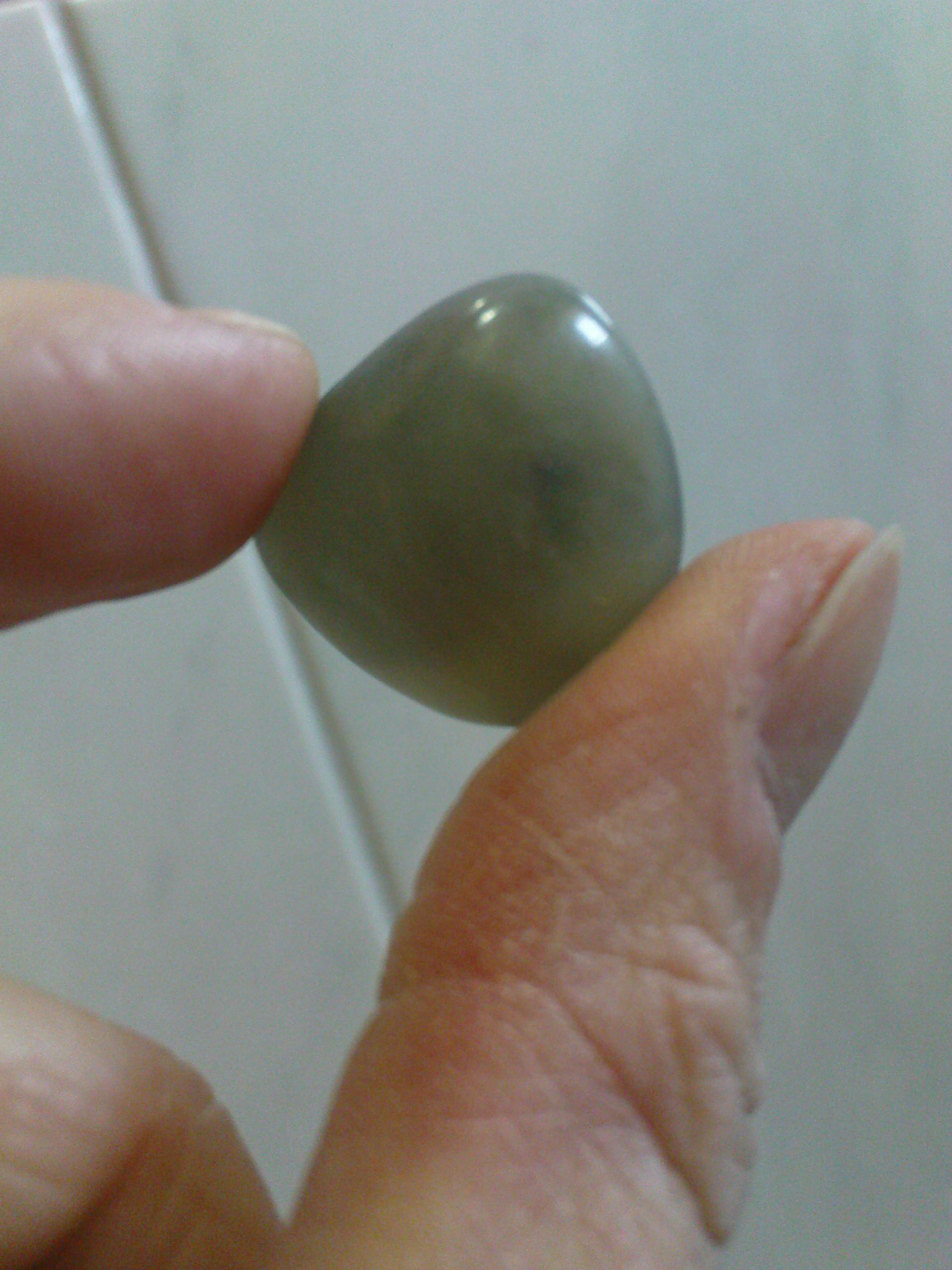 Hier ist noch ein komischer grüner. Diesmal kein Eigenfund. Sorry für das erste Bild, ich wollte mal irgendwie verdeutlichen, dass er leicht durchscheinend ist und man so die schwarzen Flecken darin gut erkennen kann...die Sonnenstrahlen haben dabei immer ein bisschen gestört. Ansonsten sieht der Stein sehr matt aus.