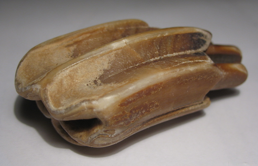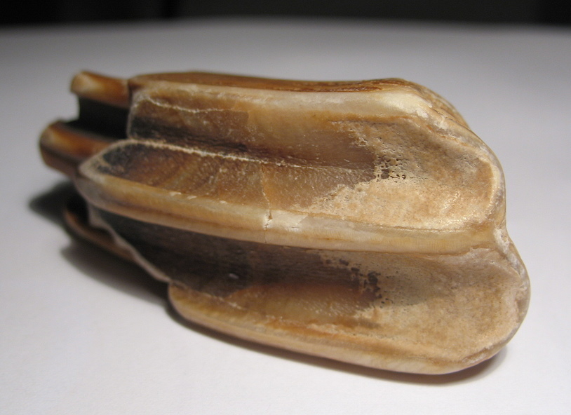 Meine Recherchen haben ergeben, dass es sich um einen (Pferde-)Zahn aus dem Pleistozän handelt.