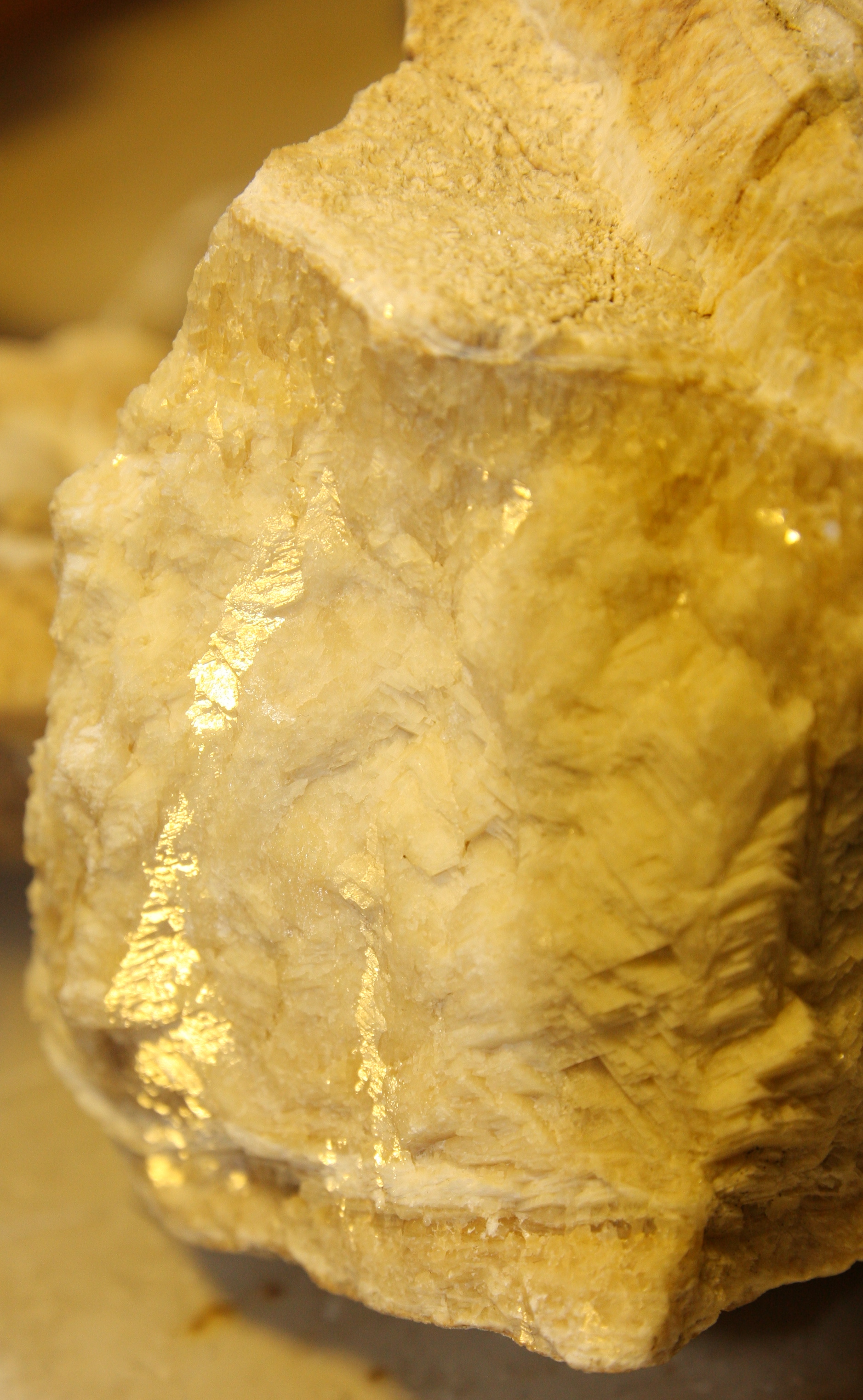 Der Glanz ist mehr seidig, die Plättchen sind schuppenartig, wie kleine Dreiecke angeordnet. Unten und oben sind dann wieder Kalkstein und kleine Kristalle abwechselnd.