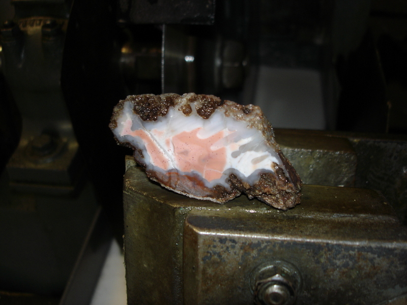Wie ich ja schon unter den eigenen Schätzen vorgestellt habe, wartet da ein kleiner Achat-Klops darauf, nach erstem Anpolieren durchgesägt zu werden. Mein Vater ist Handwerker und hat schon ein paar Erfahrungen mit dem Schleifen, Polieren und Durchbohren von verschiedenen Steinen, mit ihm zusammen habe ich das gute Stück schon angeschliffen.