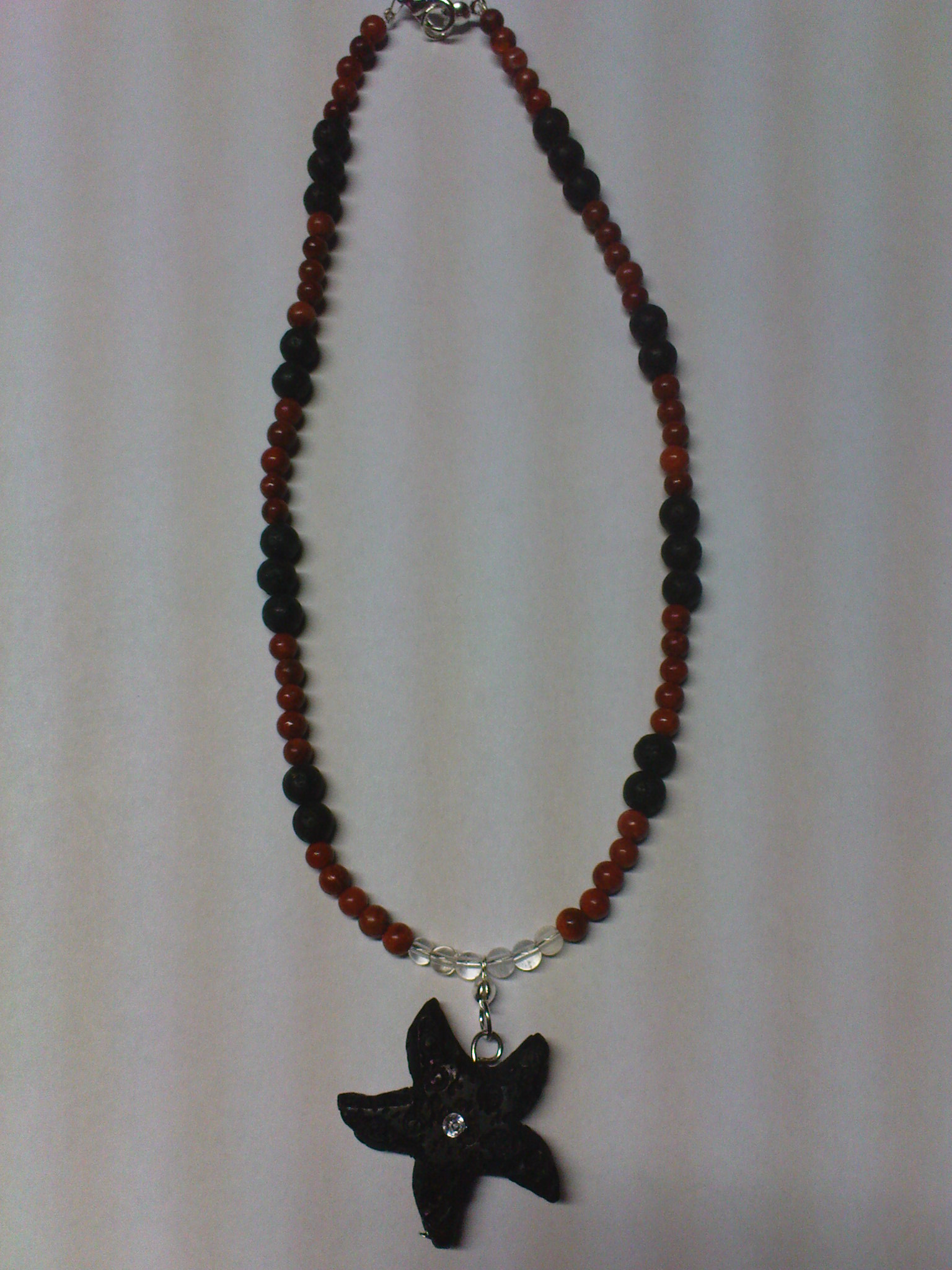Hab gleich nochmal was gekettelt gestern Abend. Im Wechsel kleine Lava- und Korallenkugeln. Um den Anhänger die restlichen Bergkristallperlen. Und den Anhänger find ich einfach traumhaft.