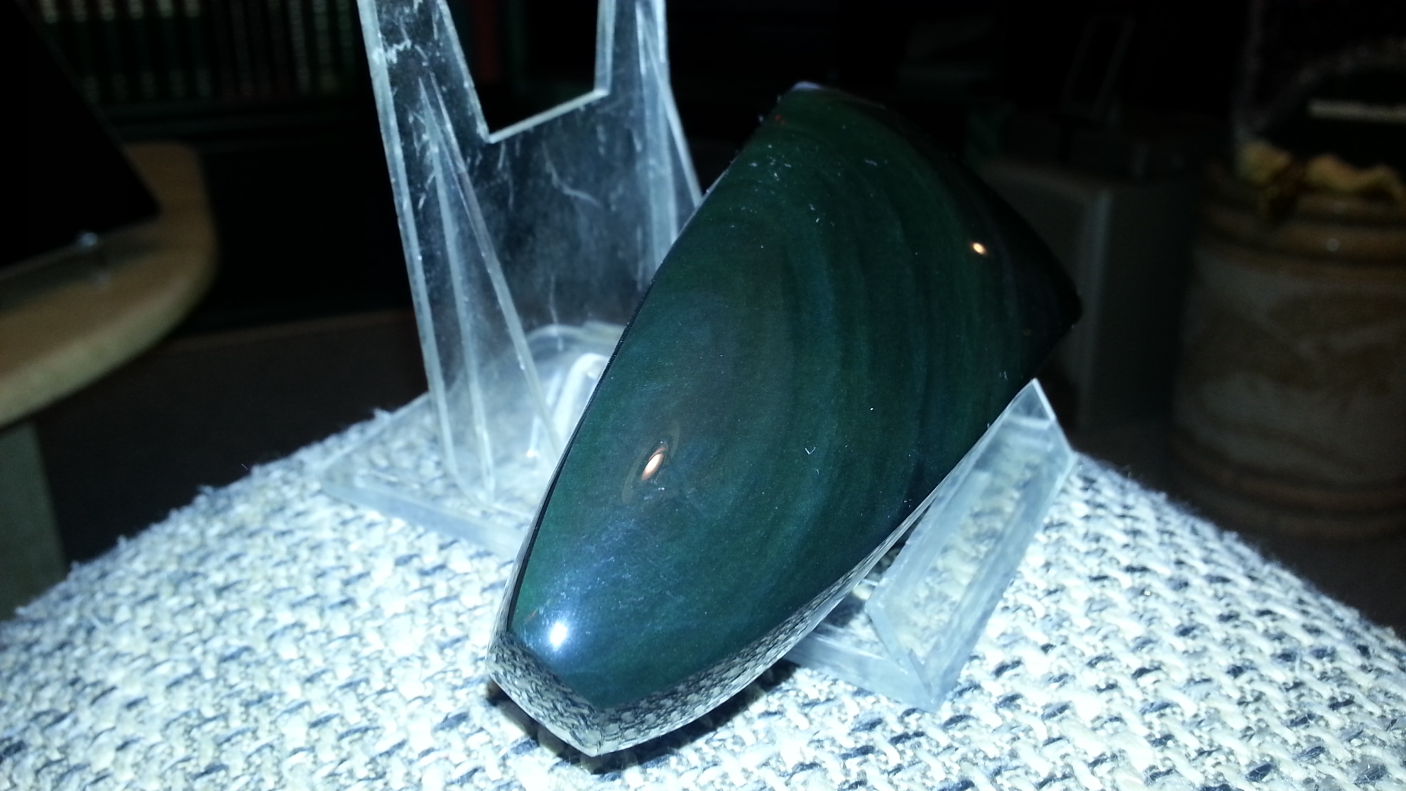 Das ist ein Regenbogenobsidian. Leider sind die schönen Farben, die er hat, nicht einfach einzufangen. Viel Spaß beim betrachten. Gruß Carsten.