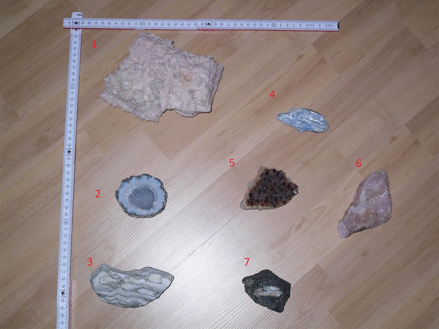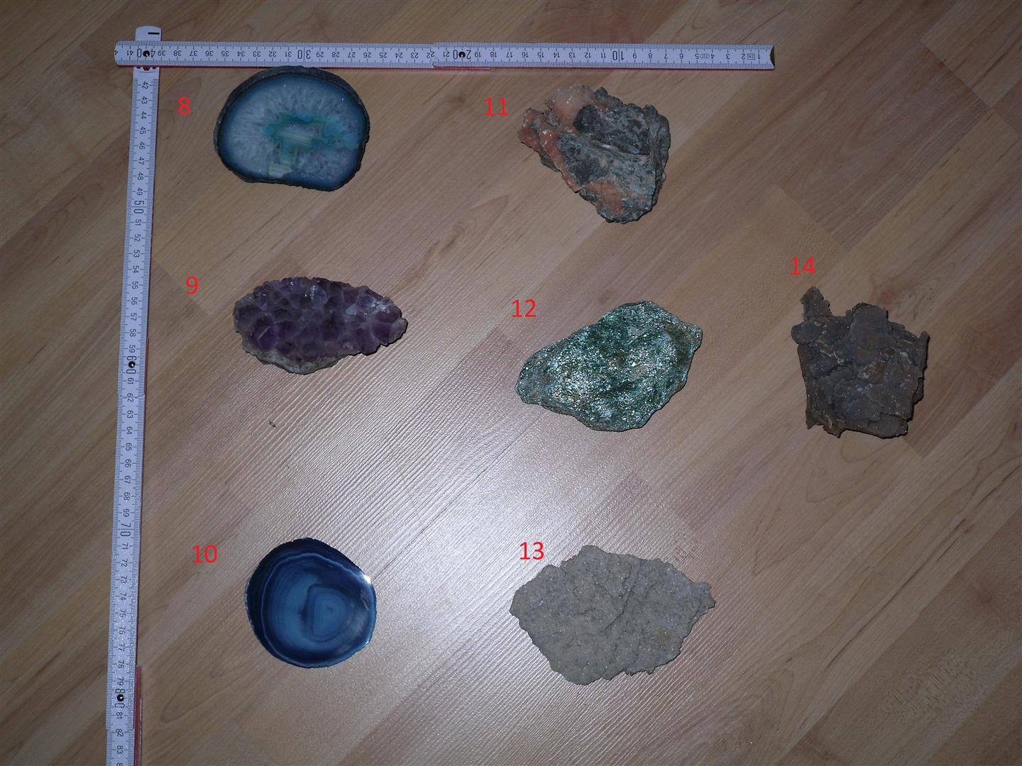 ich würd sagen Nummer 8 und 10 sind blau gefärbte Achatscheiben, 9 eine Amethystdruse und bei der 5 würde ich auf eine gebrannte Amethyststufe tippen. Zum Rest kann ich leider nichts sagen.