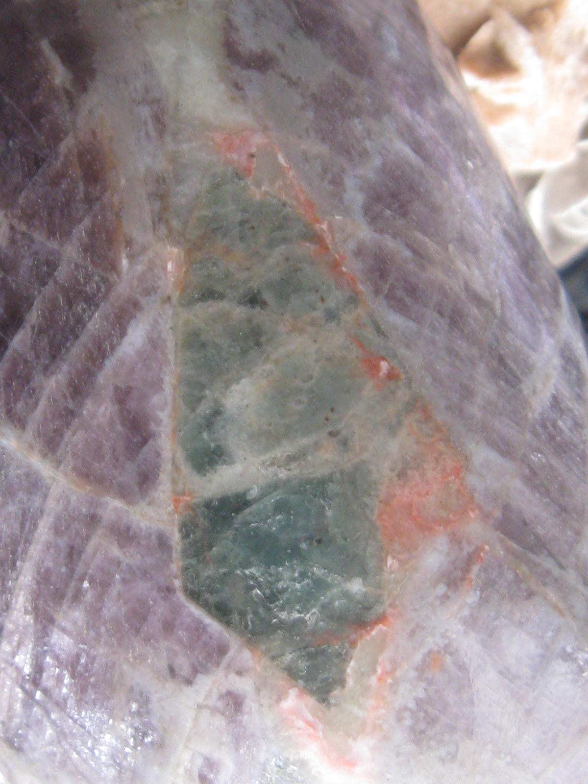 Die "blaue Krawatte mit rotem Saum (ich glaube ihr sagt "de das" oder so ähnlich zur Krawatte)" in deinem Anhydrit ist wahrscheinlich ebenso Anhydrit. Die Grünen Anteile rechts unten im zweiten Bild kann ich nicht genau zuordnen. Das Irisieren entsteht dadurch, dass dieser Anhydrit sehr durchsichtig ist und durch die Lichtbrechung an den feinen Schichtstrukturen entstehen dann solche Regenbogenfarben.