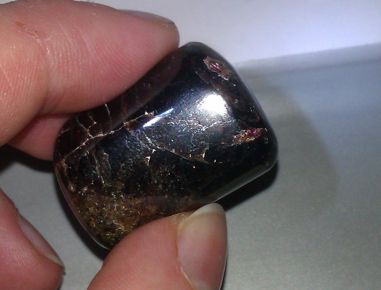 Soll Granat sein, hat jedoch Glitzerefekt, Schlieren die nach Granat (Pyrop etc. ) aussehen, aber auch braun-gelbe Schlieren und Flecken und welche die die farbe von rubin (rot-lila) haben. Poliert glänzt er leicht silbern und ist recht schwer auf den ersten Blick dachte ich es ist Hämatit-irgendwas....