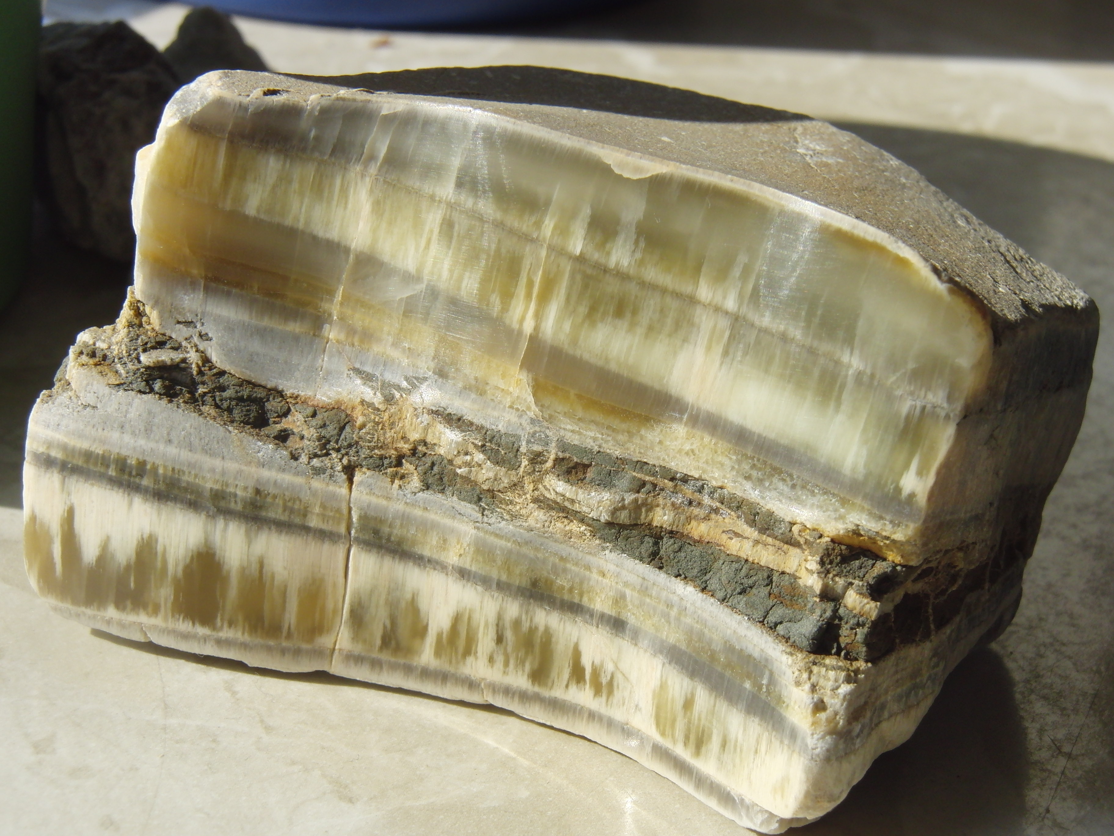 auch ich sammel und bearbeite Faserkalk seit vielen Jahren. Zum Bearbeiten setze ich auf Schleif- und Polierschwämme (100er, 400er, 800er und 1000er). Der Dremel kommt nur selten zum Einsatz. Deine Steine sehen extrem gut poliert aus. Welche Polierpaste benutzt Du. Die Dremel-Polierpaste verursacht leider Verfärbungen im Stein. Derzeit benutze ich als "finish" ein leichtes Waffenöl. So ganz glücklich bin ich aber noch nicht damit. Wenn Du mir hier noch einen Tipp geben könntest, wäre ich glücklich.